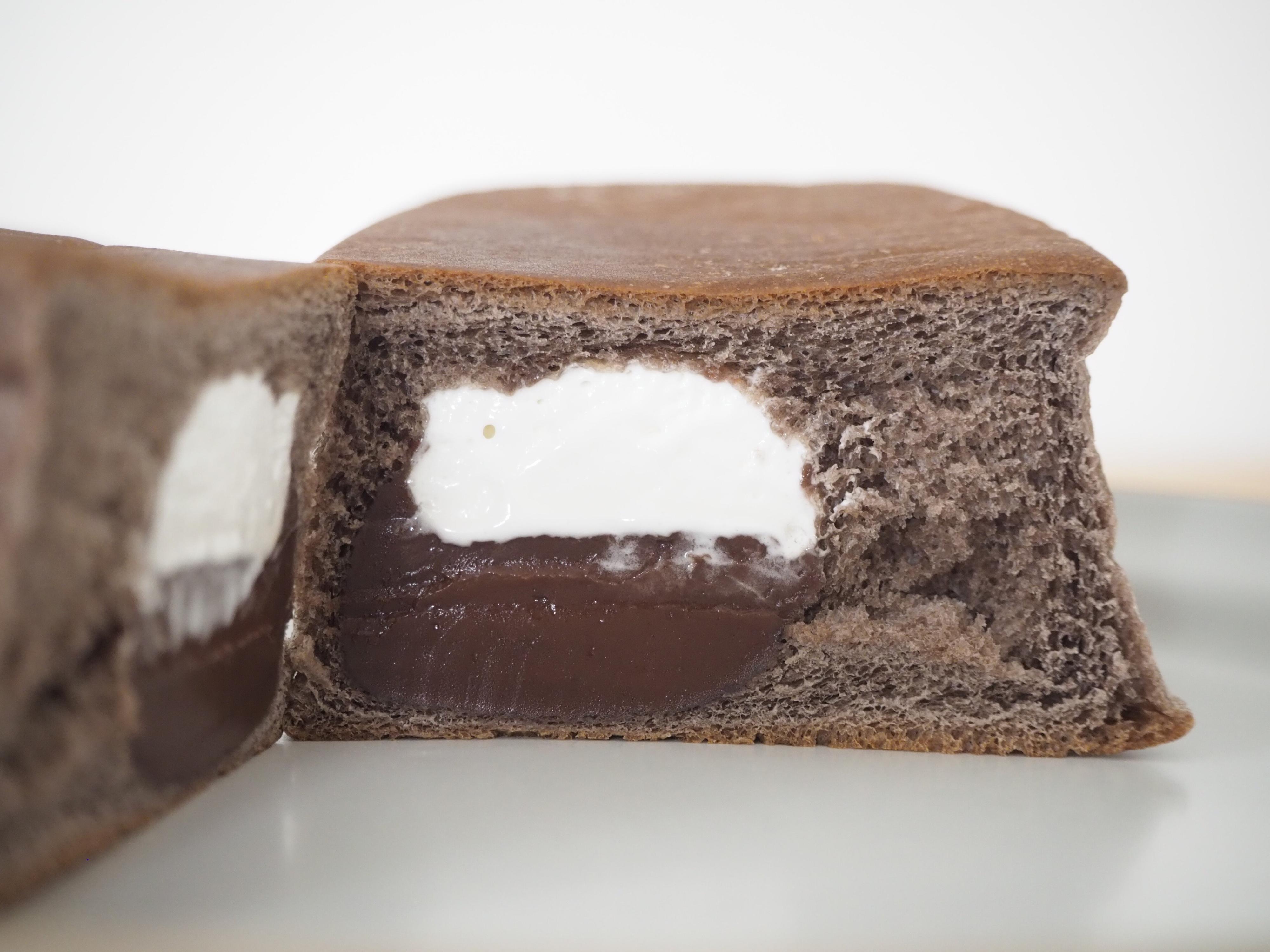 中にはホイップクリームとチョコクリームが入っています。ホイップクリームは重めの食感でミルク感が強いのがいいですね。チョコクリームは、これまた重めでカスタードクリームのよう。ミルキーなチョコレートの甘さには癒しを感じます。