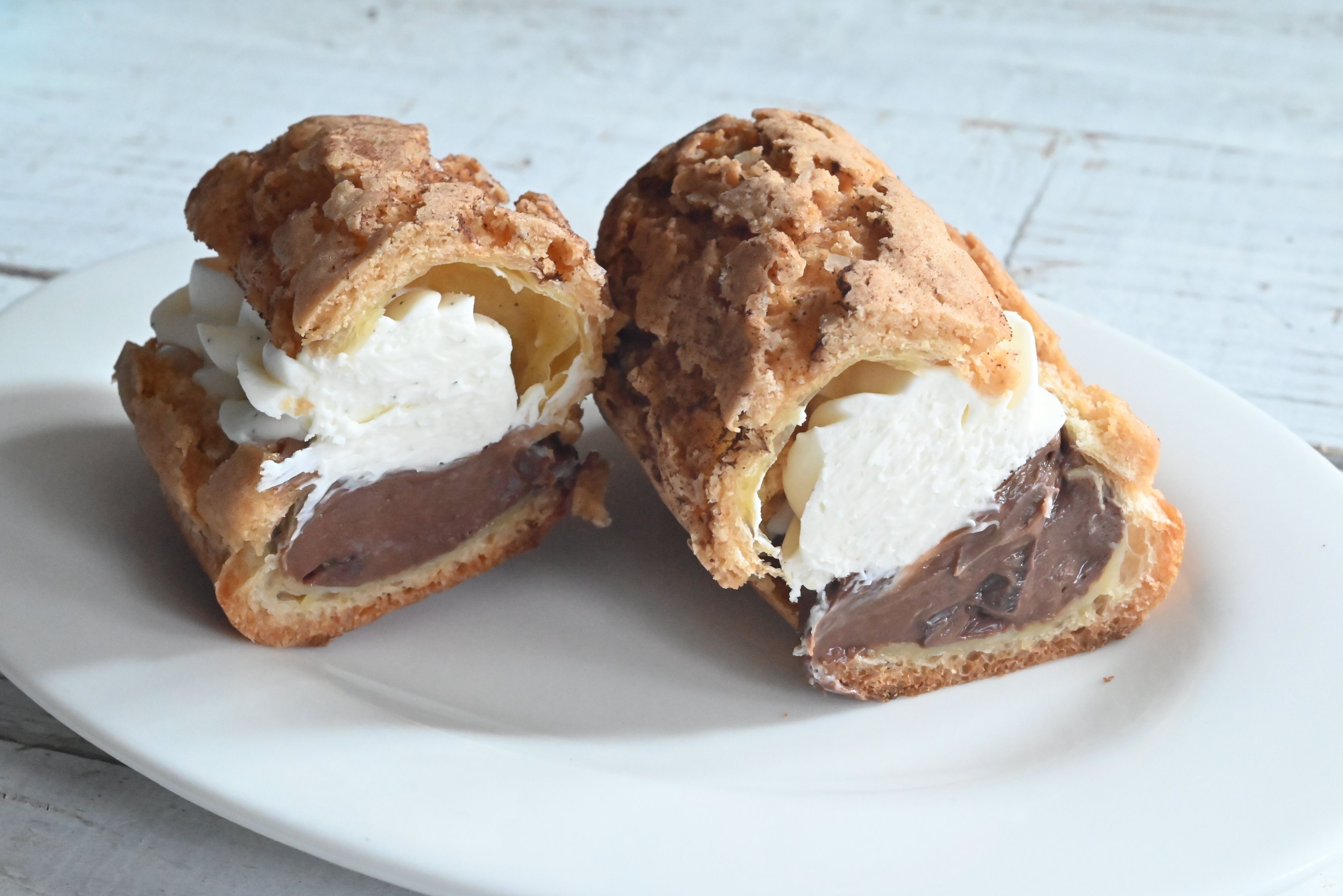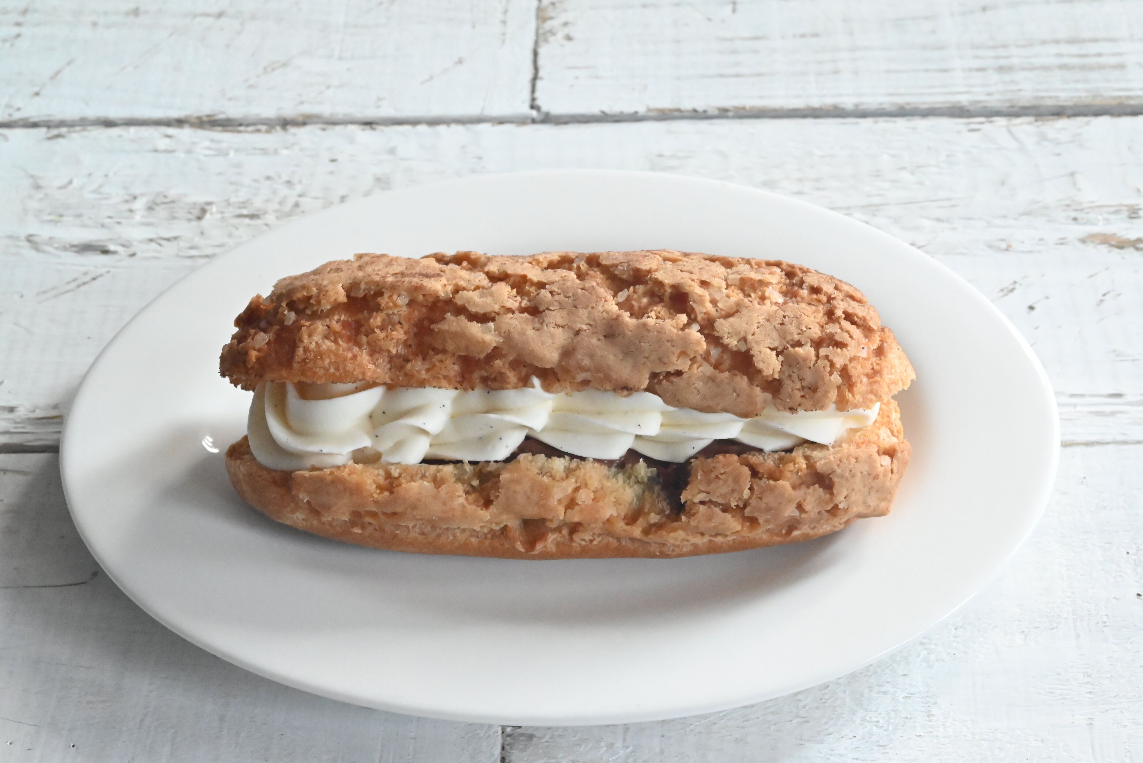 歯切れの良い生地にチョコカスタードクリームとバニラホイップクリームが挟まれています。