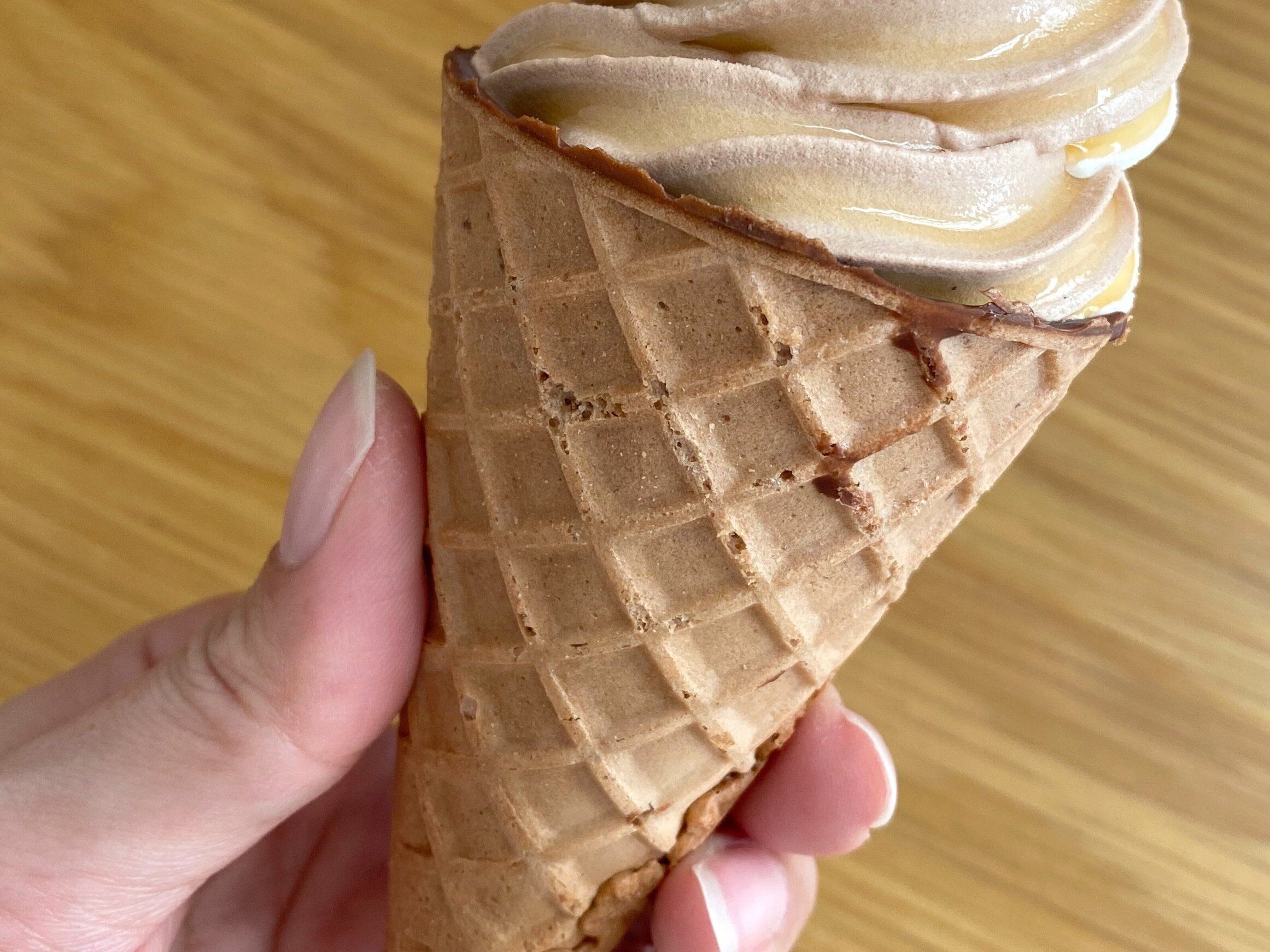 ワッフルコーンのカリカリっとした食感は口どけなめらかなアイスのアクセントになっていて、食べ応え抜群です。