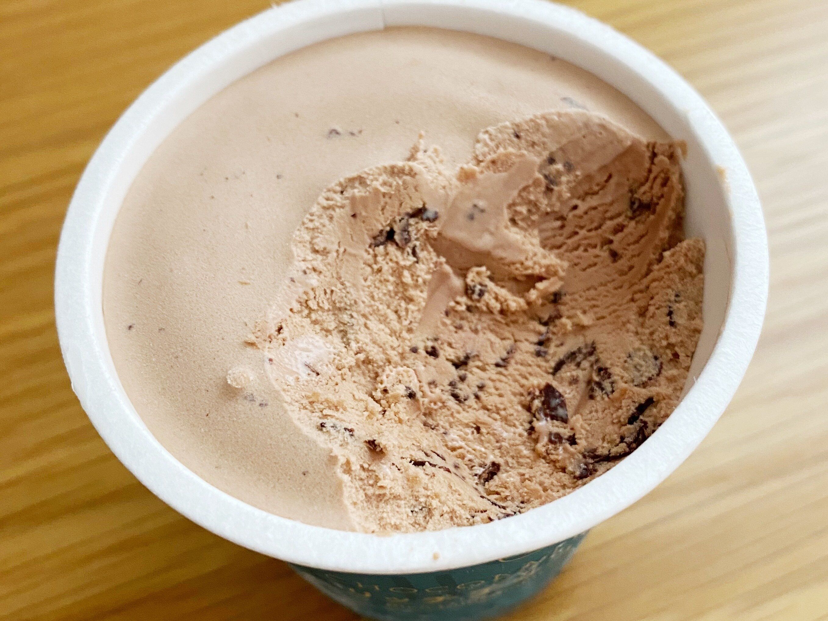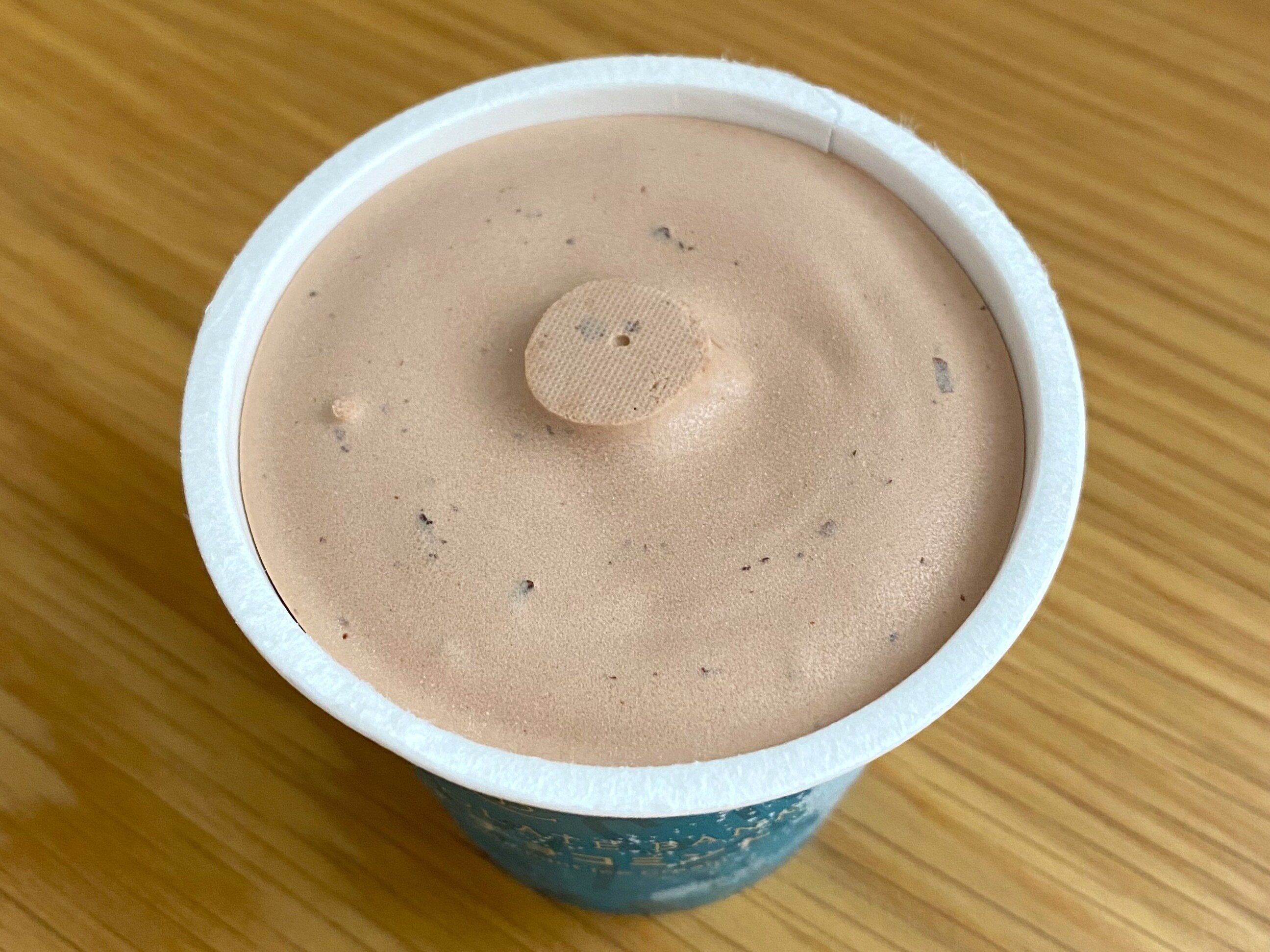 蓋を開けるとチョコレートアイスのようなビジュアルですが、口に入れた瞬間にミントの爽やかな香りがふわぁっとひろがります。ミントは優しく香る程度でチョコレートの濃厚な味わいと生乳のミルキーさがメインのアイスです。