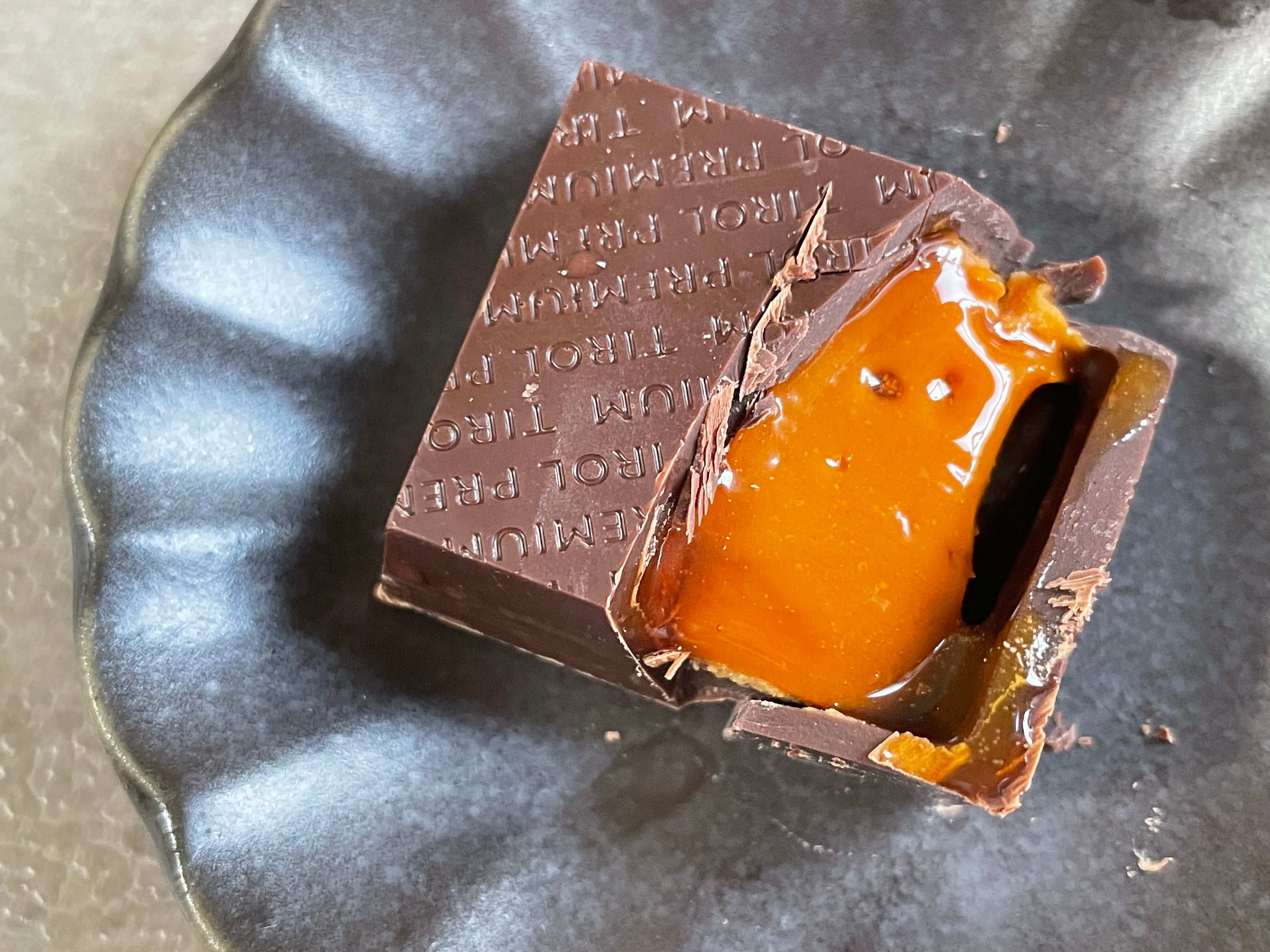 マダガスカル産カカオマス使用のハイカカオチョコの中にキャラメルガナッシュとビターキャラメルソースが入っています。