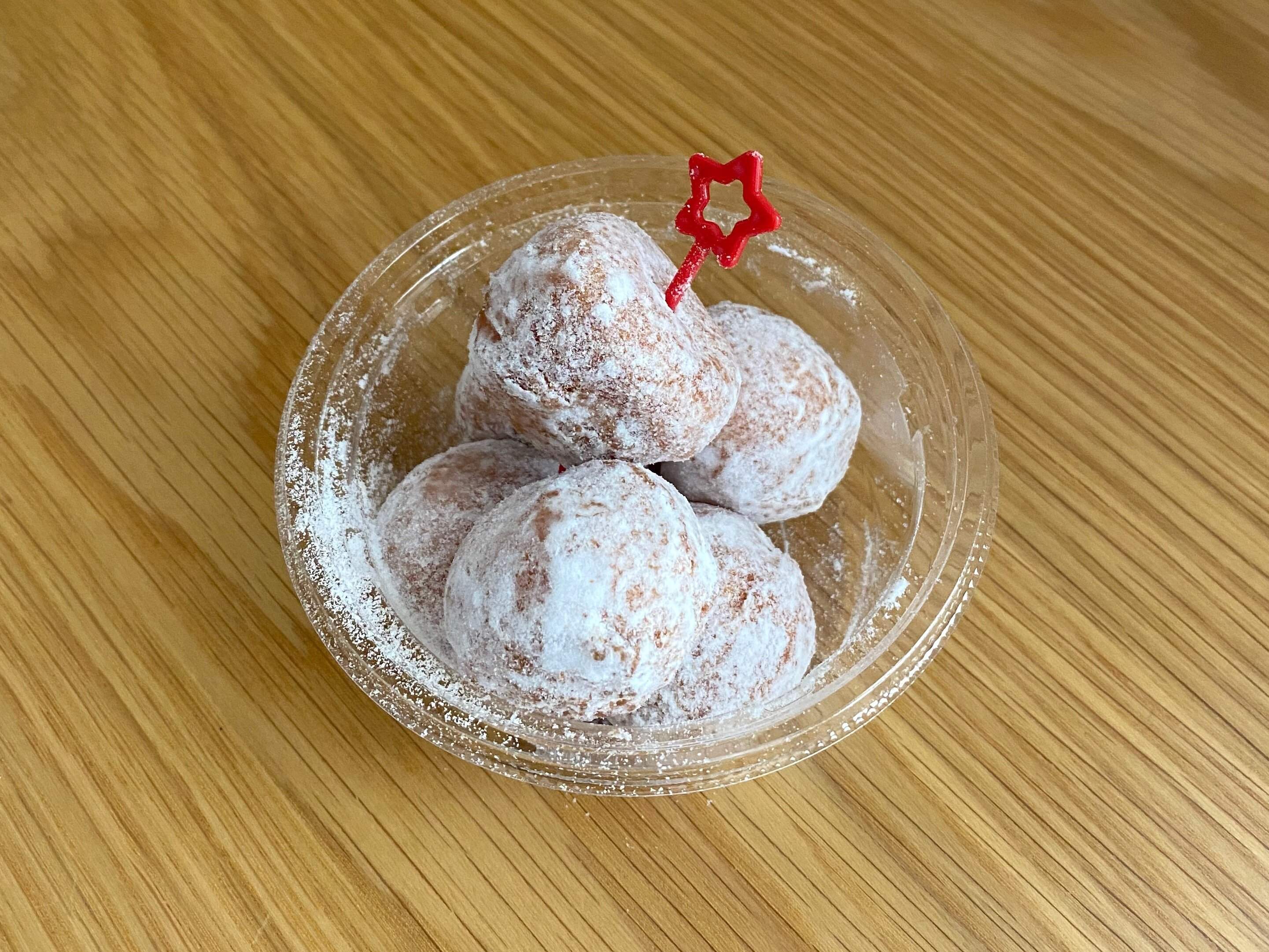 牛乳を使用したボール型のドーナツに粉糖がまぶされています。