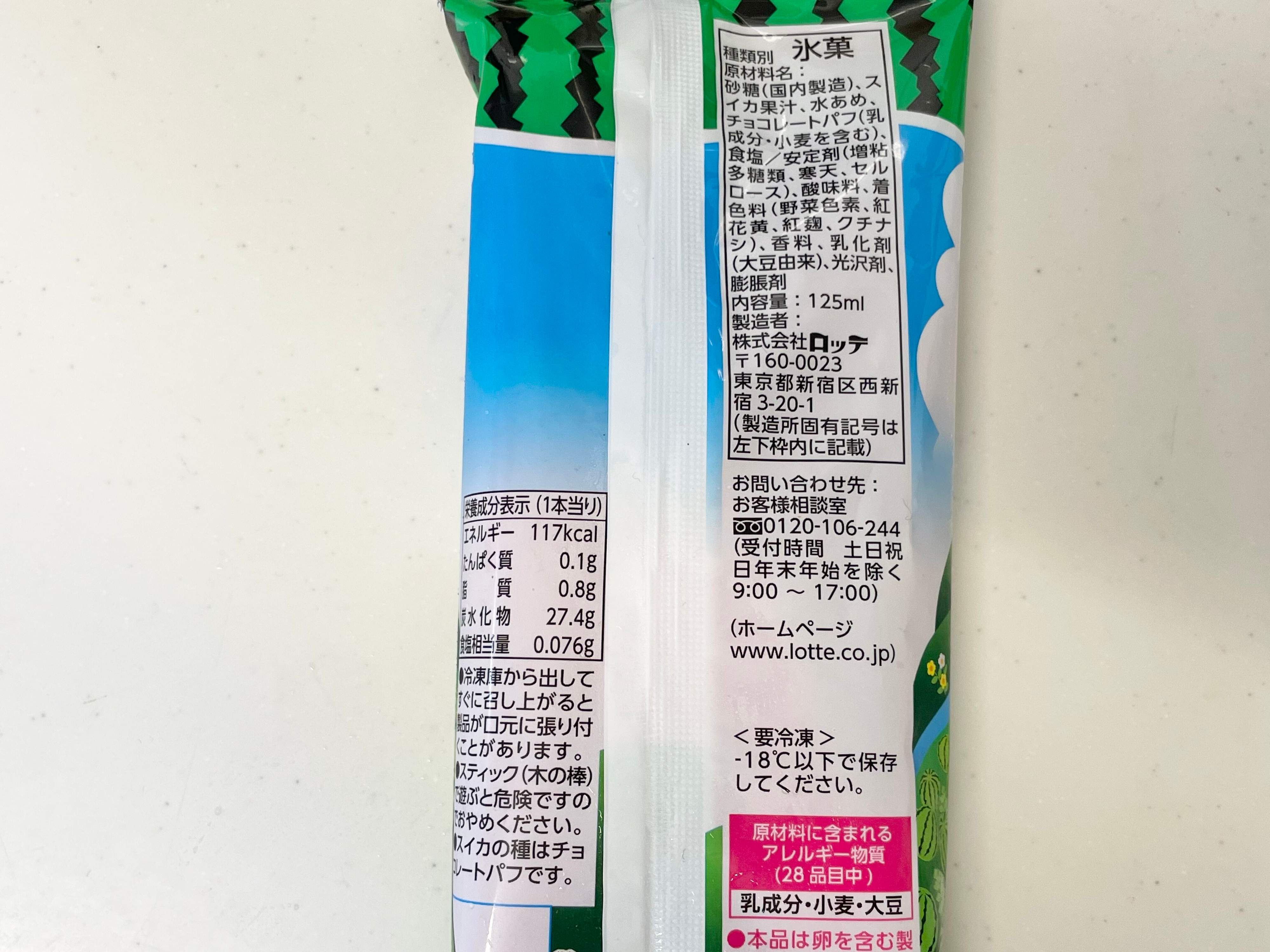 ちなみにスイカの皮をイメージした緑色の部分が何味かわかりますか?私は勝手にメロン味だと思っていたんですが、じつはスイカ味なんですよ。原材料を見てわかる通り、メロン果汁は入ってないんです。全部スイカ味だったとは!食べてみると納得。