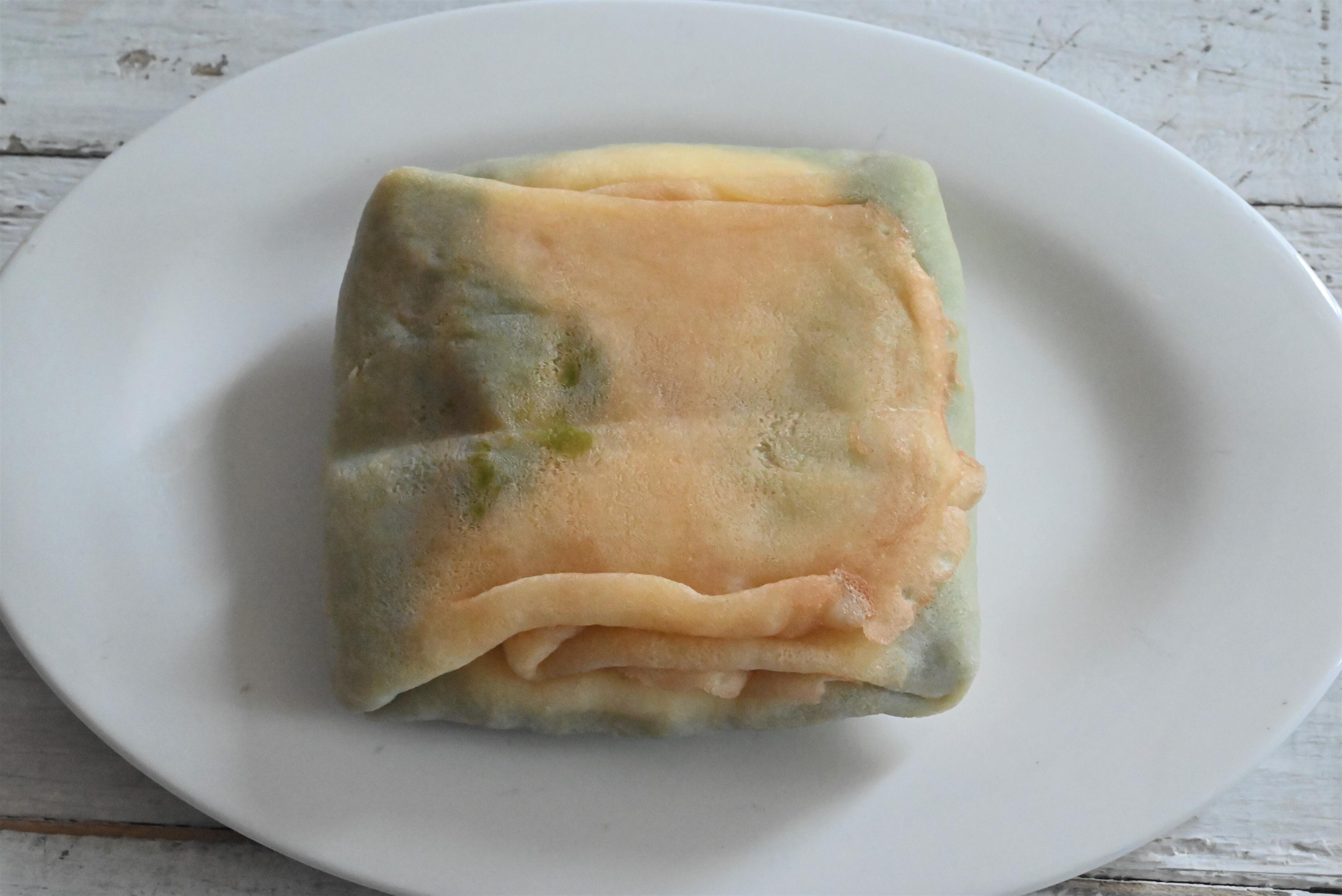 クレープ生地が3層のクリームを四角く包んでいて、ワンハンドで食べられます。