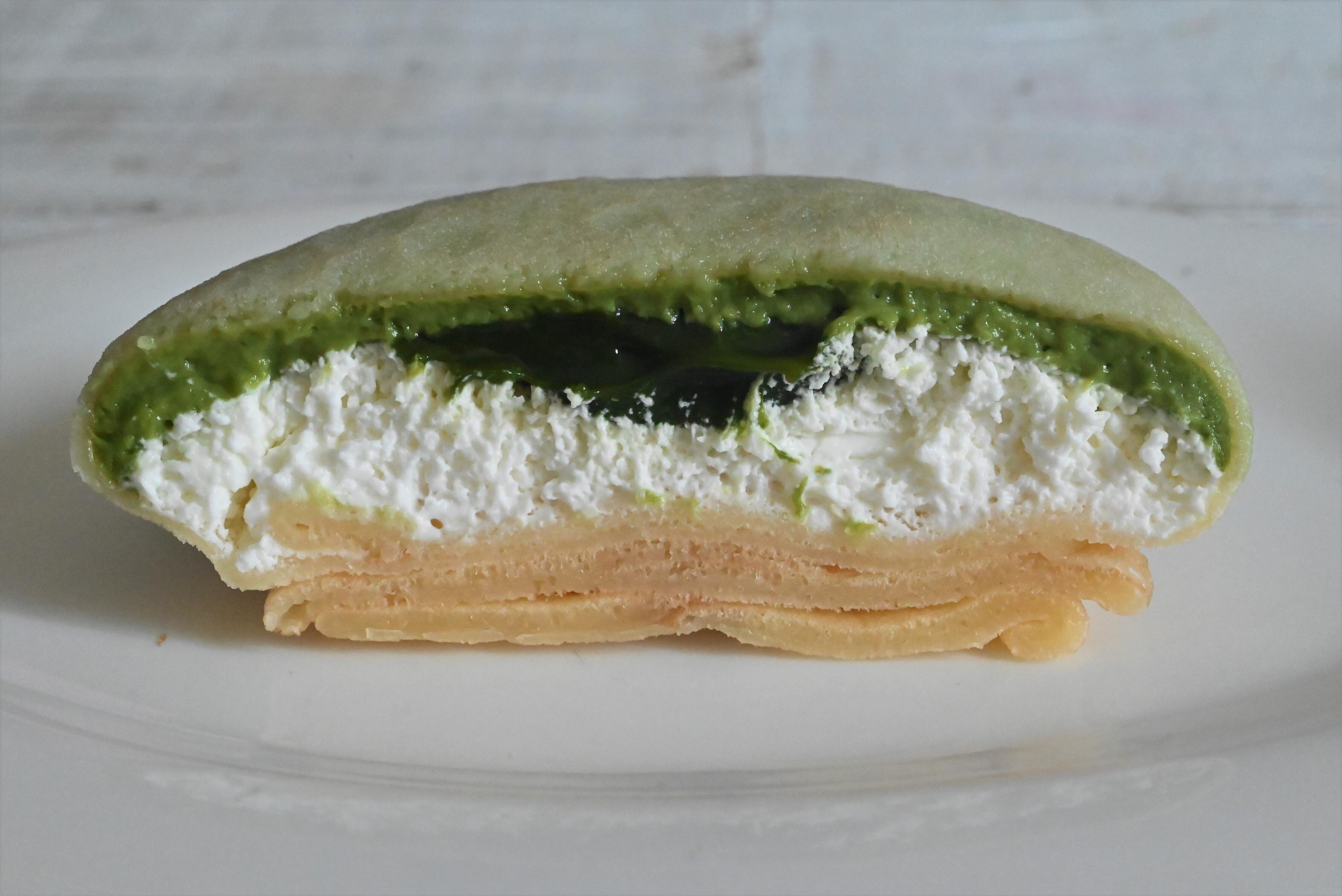 半分に切ると、抹茶クリーム、抹茶ソース、ホイップクリームが姿を表します。