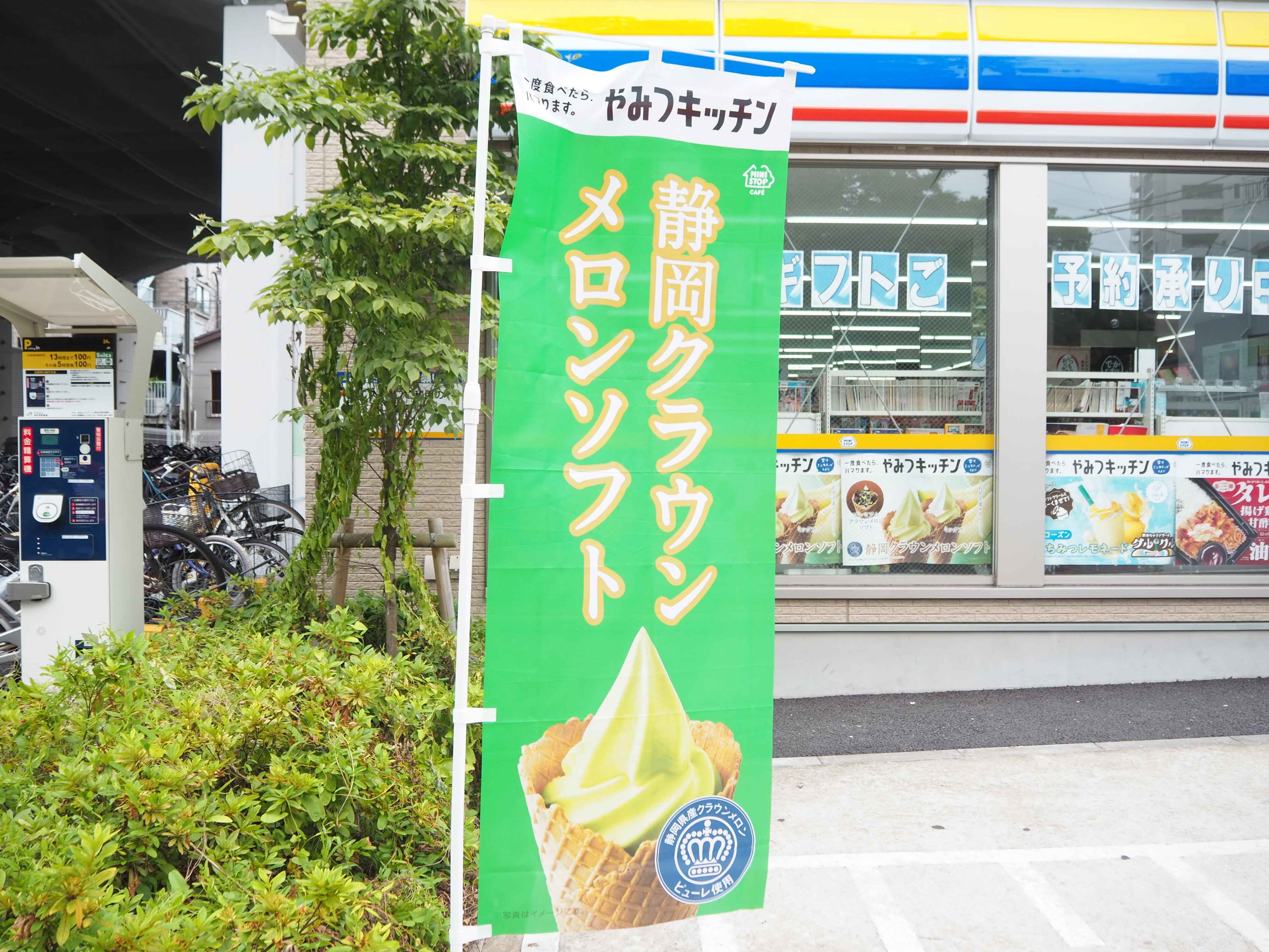 公式ホームページの情報によると、「静岡クラウンメロンソフト」には、果実の王様と呼ばれるクラウンメロンのピューレを5.1%配合。お店の外にはのぼりがあり、力を入れている商品であることがわかります。