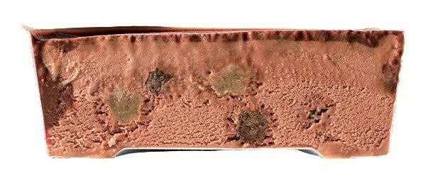 (坂)「濃厚な生チョコの下に、チョコアイス×ラムレーズンの2層構造。ラムレーズンが思っていたより粒が大きく、みずみずしいのがたまらない!洋酒の香りが高く、大人の味」。