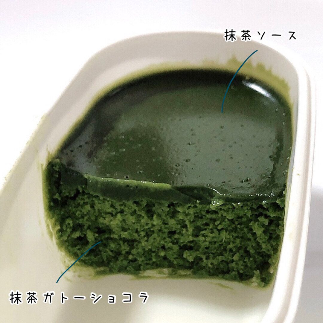 二層仕立てになっていて、抹茶ソースの下には、鮮やかな緑の抹茶ガトーショコラ生地。湯煎焼きでじっくり焼き上げることで、しっとりなめらかな食感を実現したそうです。