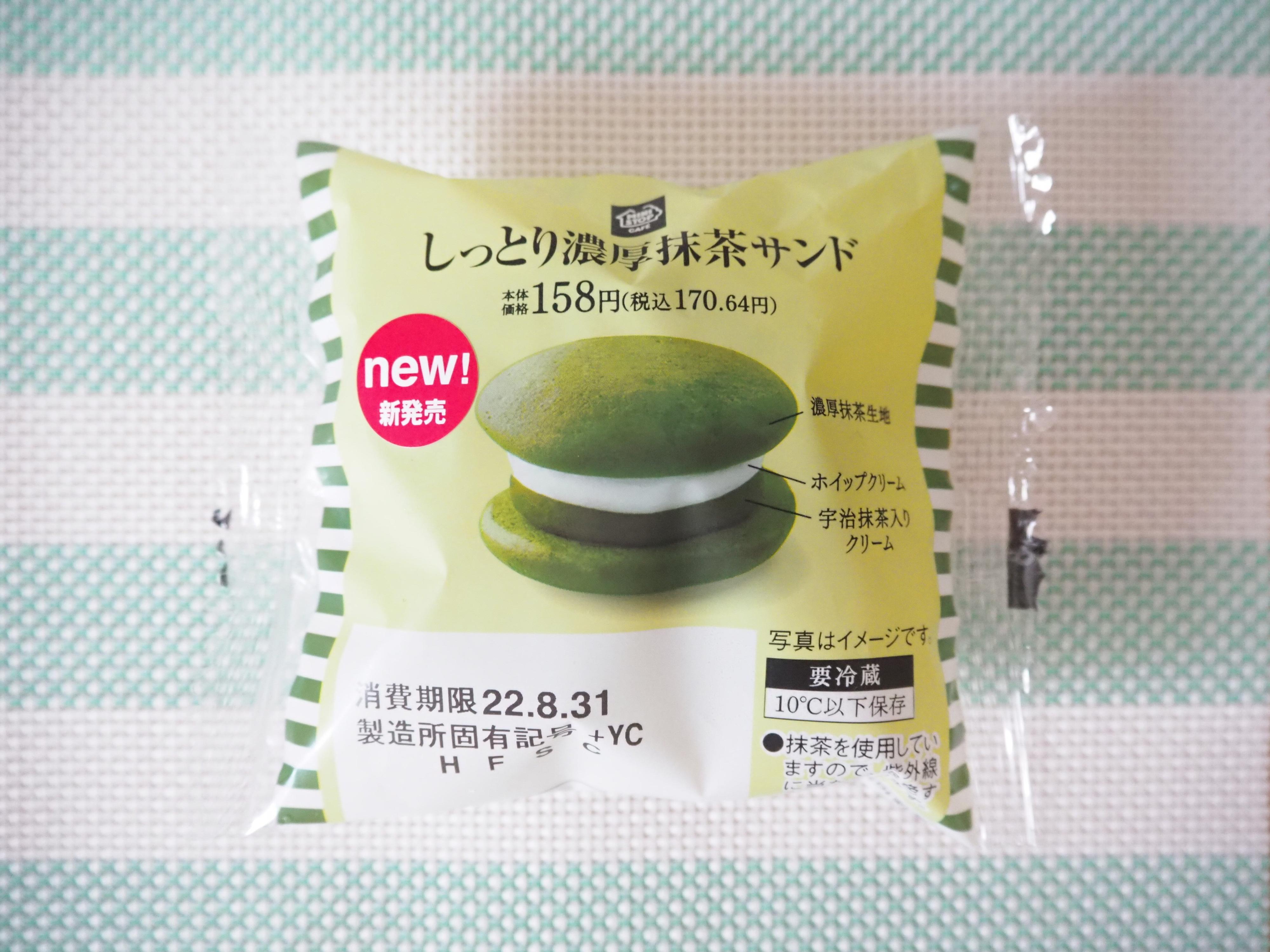 こちらが「しっとり濃厚抹茶サンド」で、価格は170円。濃厚抹茶生地で宇治抹茶入りクリームとホイップクリームをサンドしたスイーツです。2022年8月23日発売で、全国で販売されています。