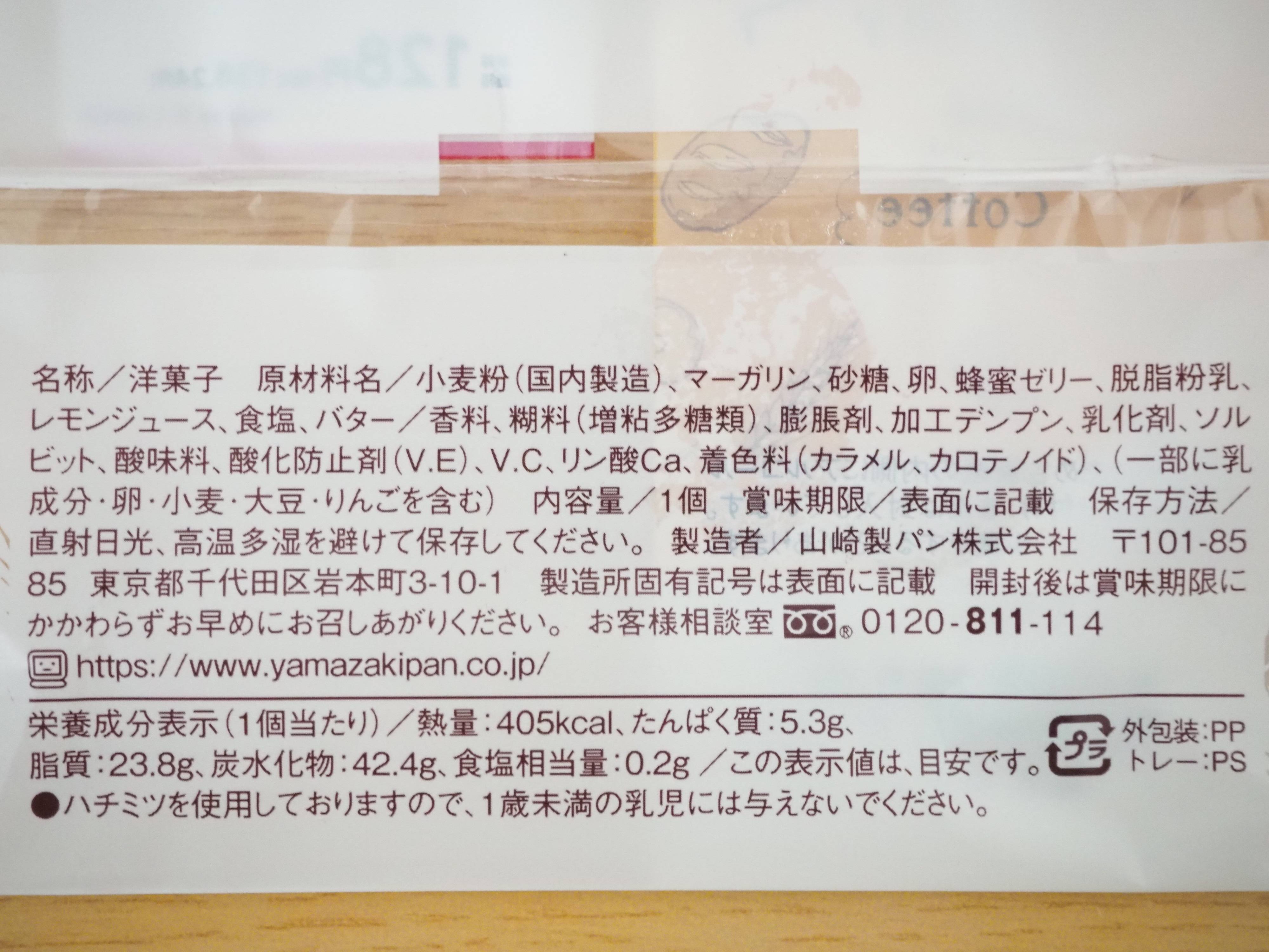 製造を担当するのは山崎製パンで、カロリーは405kcalです。なお私が購入したものの賞味期限は、購入日を含む27日でした。日持ちもするので、ストックとしてもよさそうです。