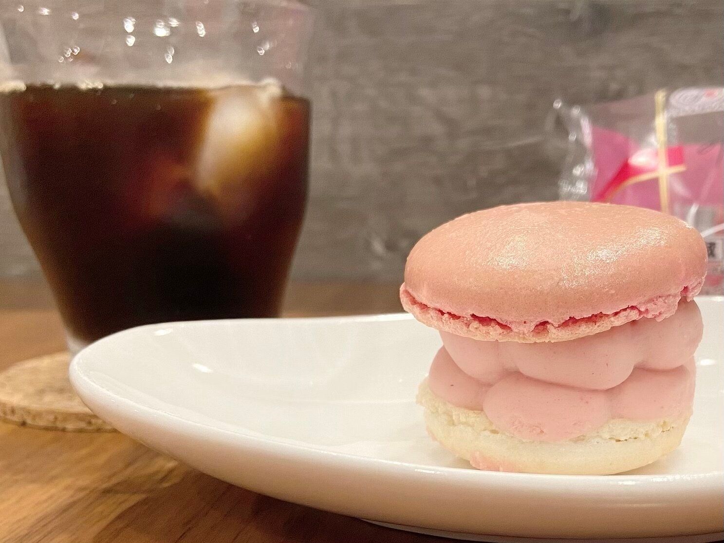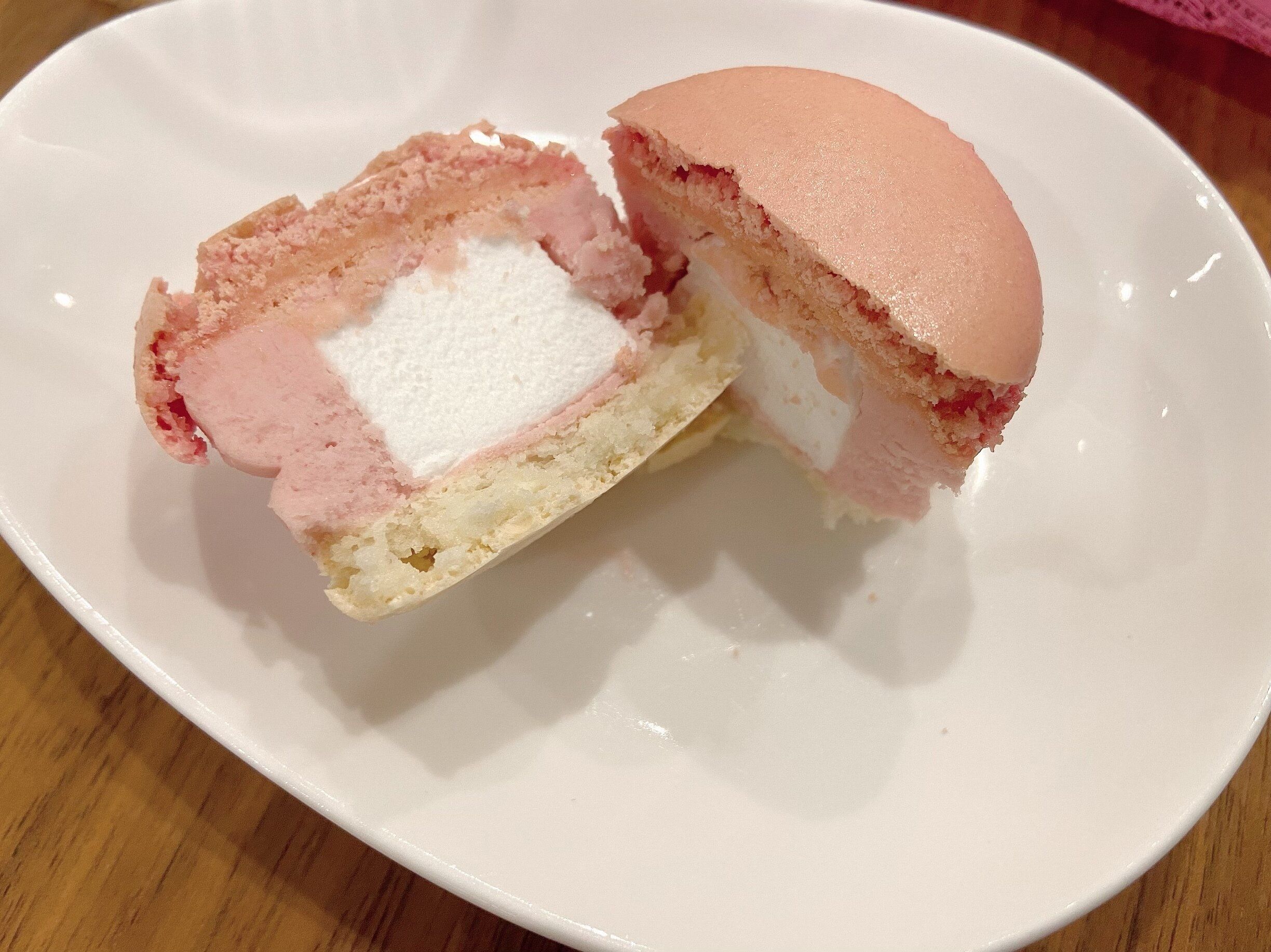 食べてみるとサクサクのマカロンに甘酸っぱいイチゴのガナッシュがおいしい。