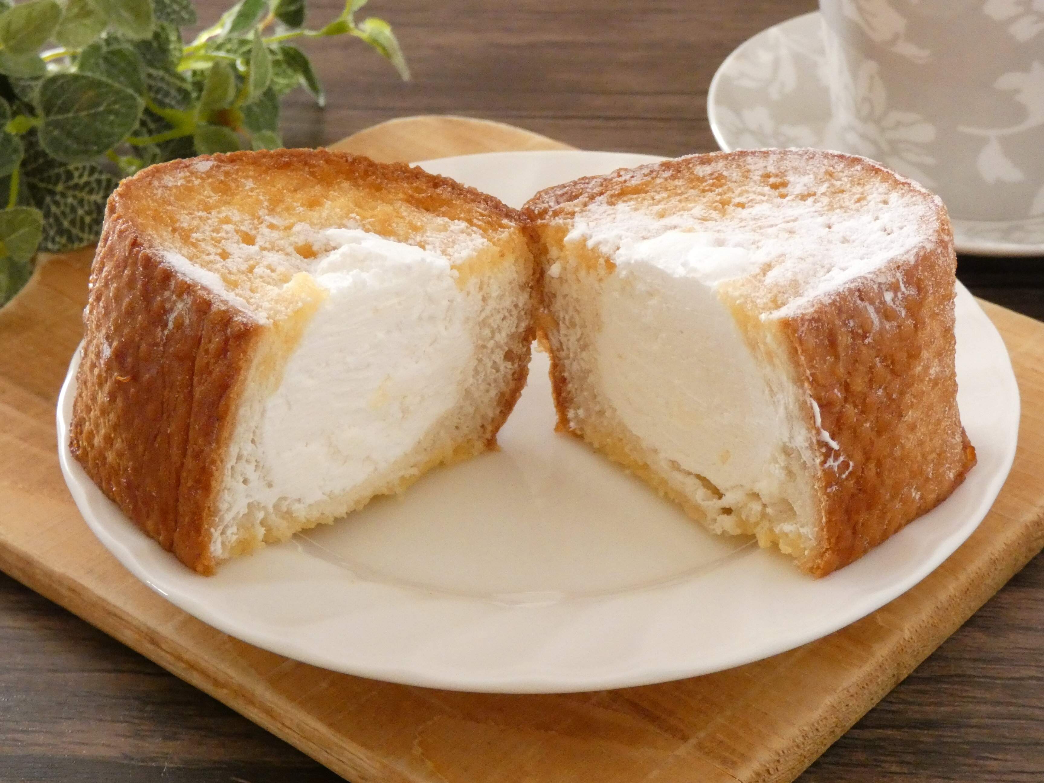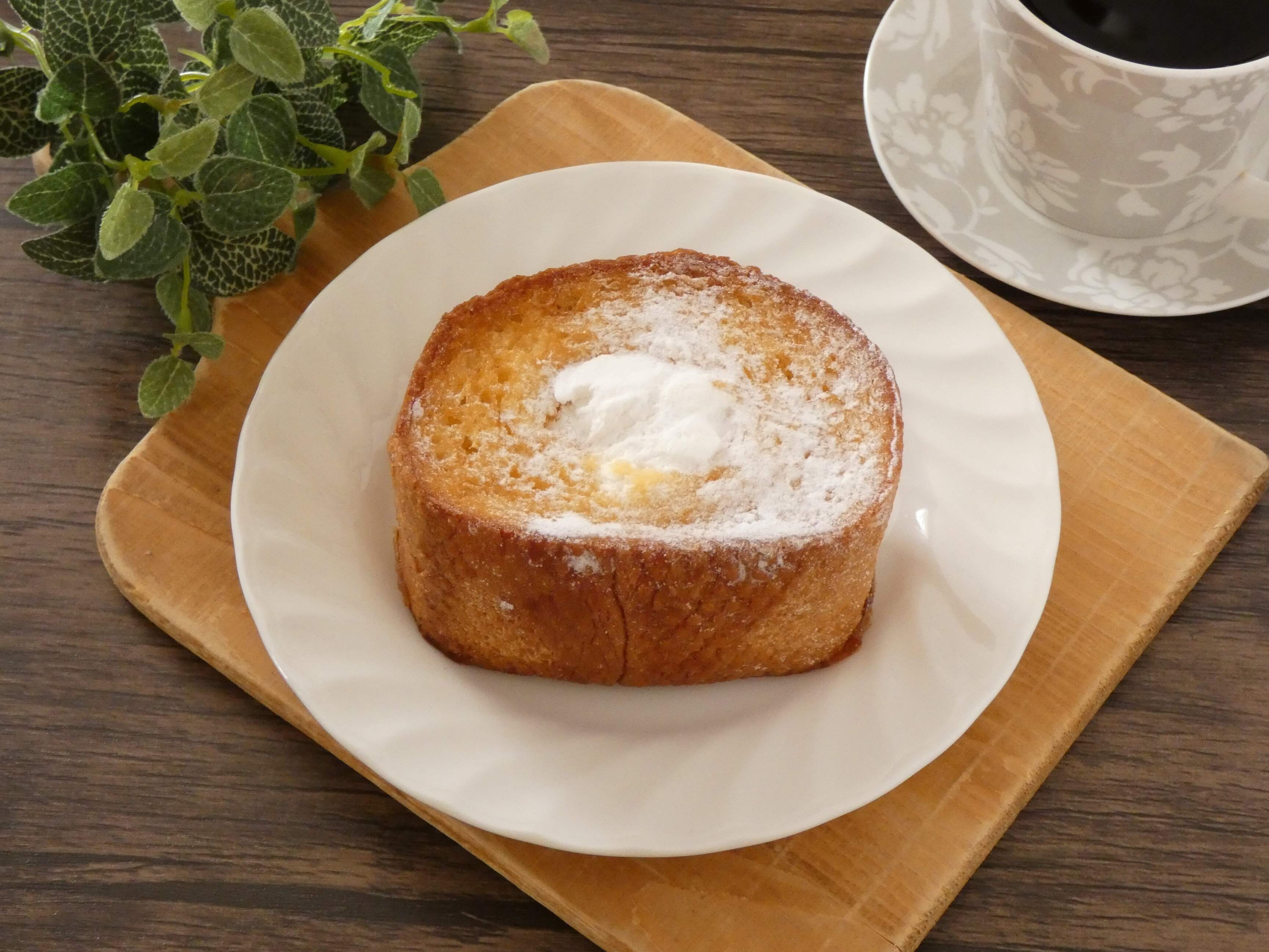 カットするとホイップクリームがぎっしりたっぷり!フランスパンは硬めで噛みごたえがあり、卵液が染み込んでじゅわっと感があります。クリームは硬めでミルキー感が強くしっかりした甘さ。この濃厚クリームがたまらないです。フランスパンとクリームの組み合わせバッチリで、ずっしりしているのにペロッと食べられます。虜になるおいしさのスイーツパンに大満足。ぜひお試しください。