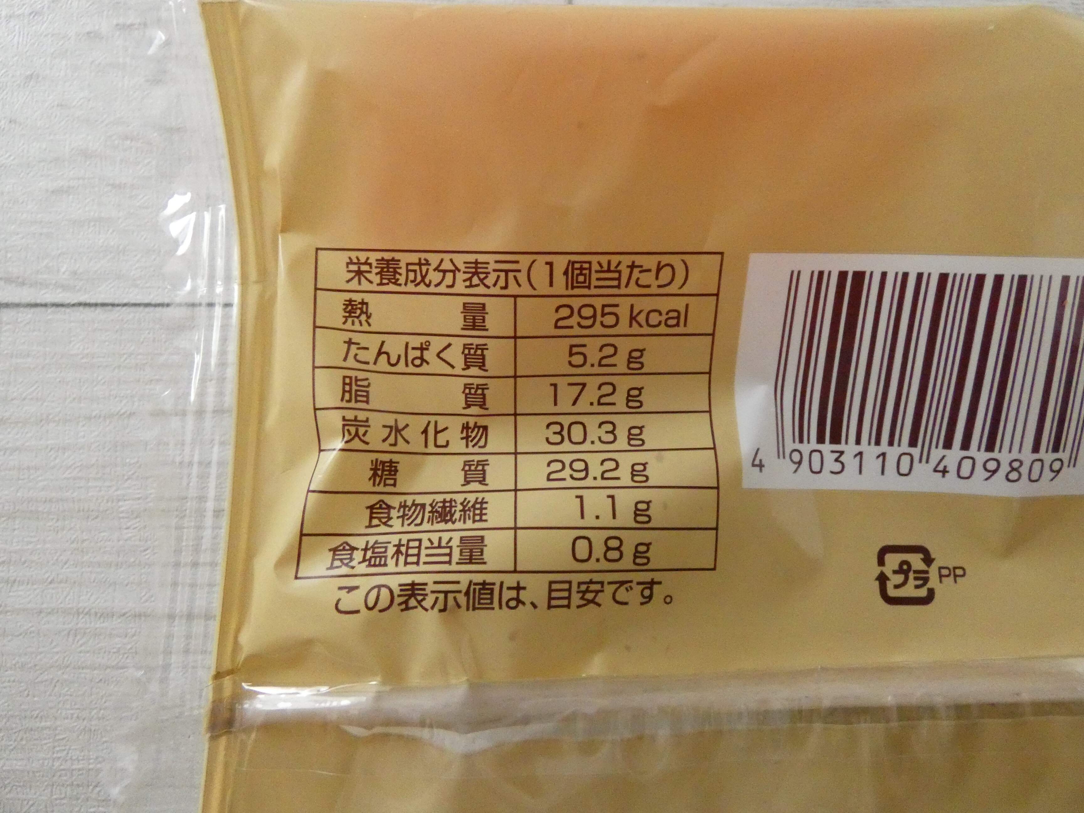 栄養成分表示を見ると、1個のエネルギーは295kcal。デニッシュ生地なのでカロリーは高めです。