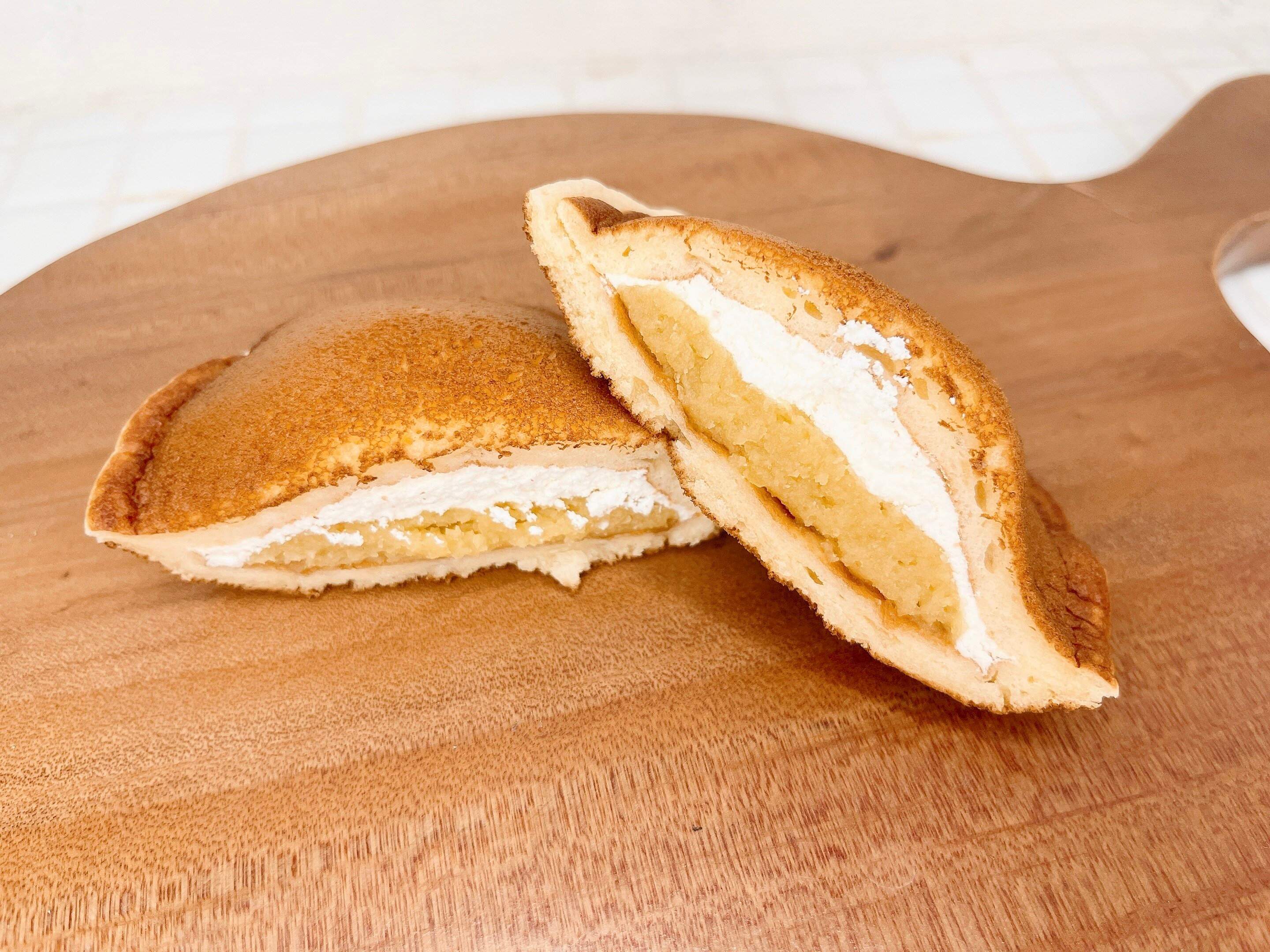 半分にカットしてみると、紅はるかを使用した濃密な芋餡が使われた芋クリームと、北海道産生クリームを配合のホイップクリームが薄皮生地の中にぎっしり詰まっています。