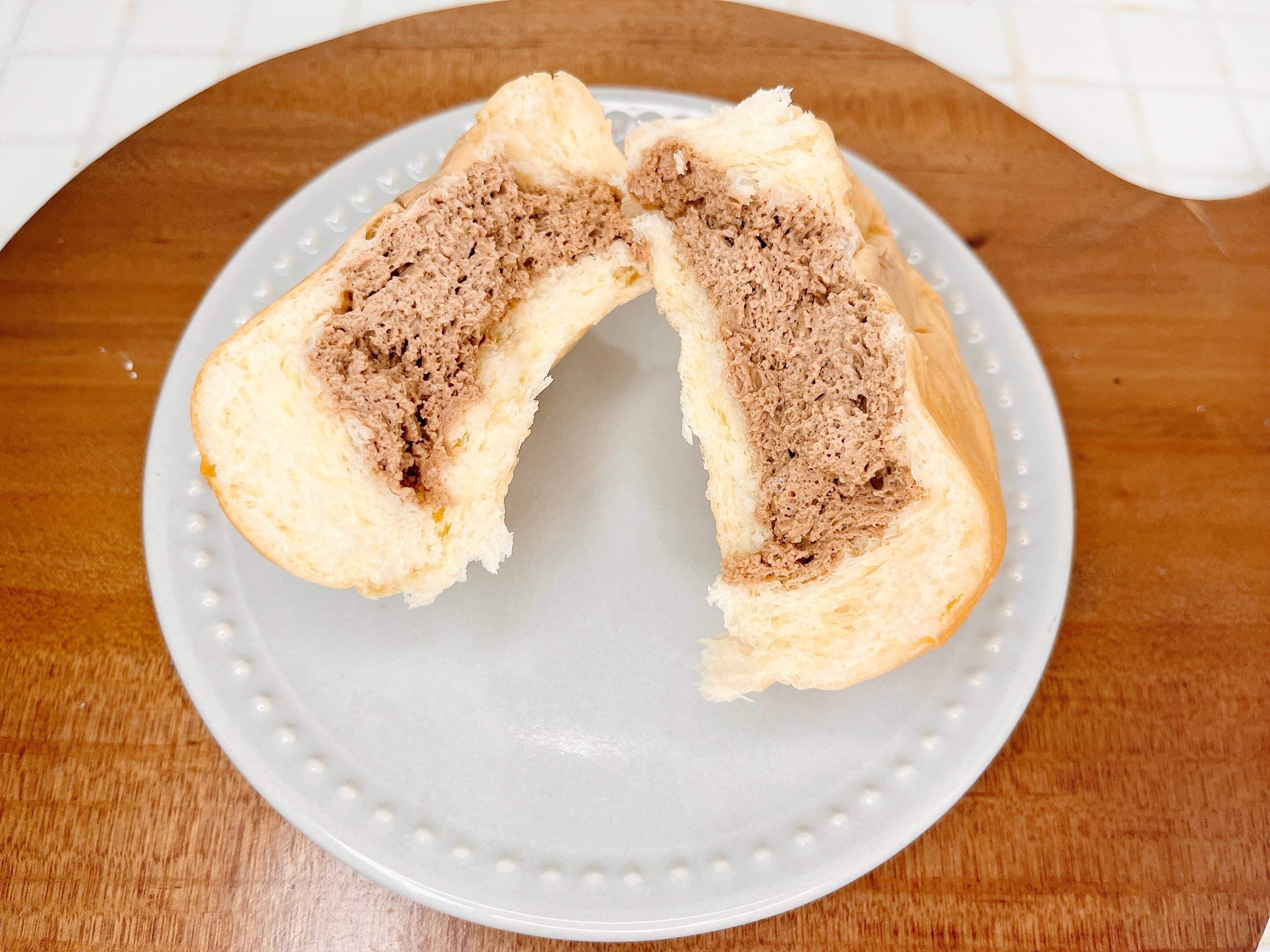 半分に割ると、カスタード同様たっぷりのチョコレートクリームが入っています。ホイップが配合されているのでミルキーなチョコ色!