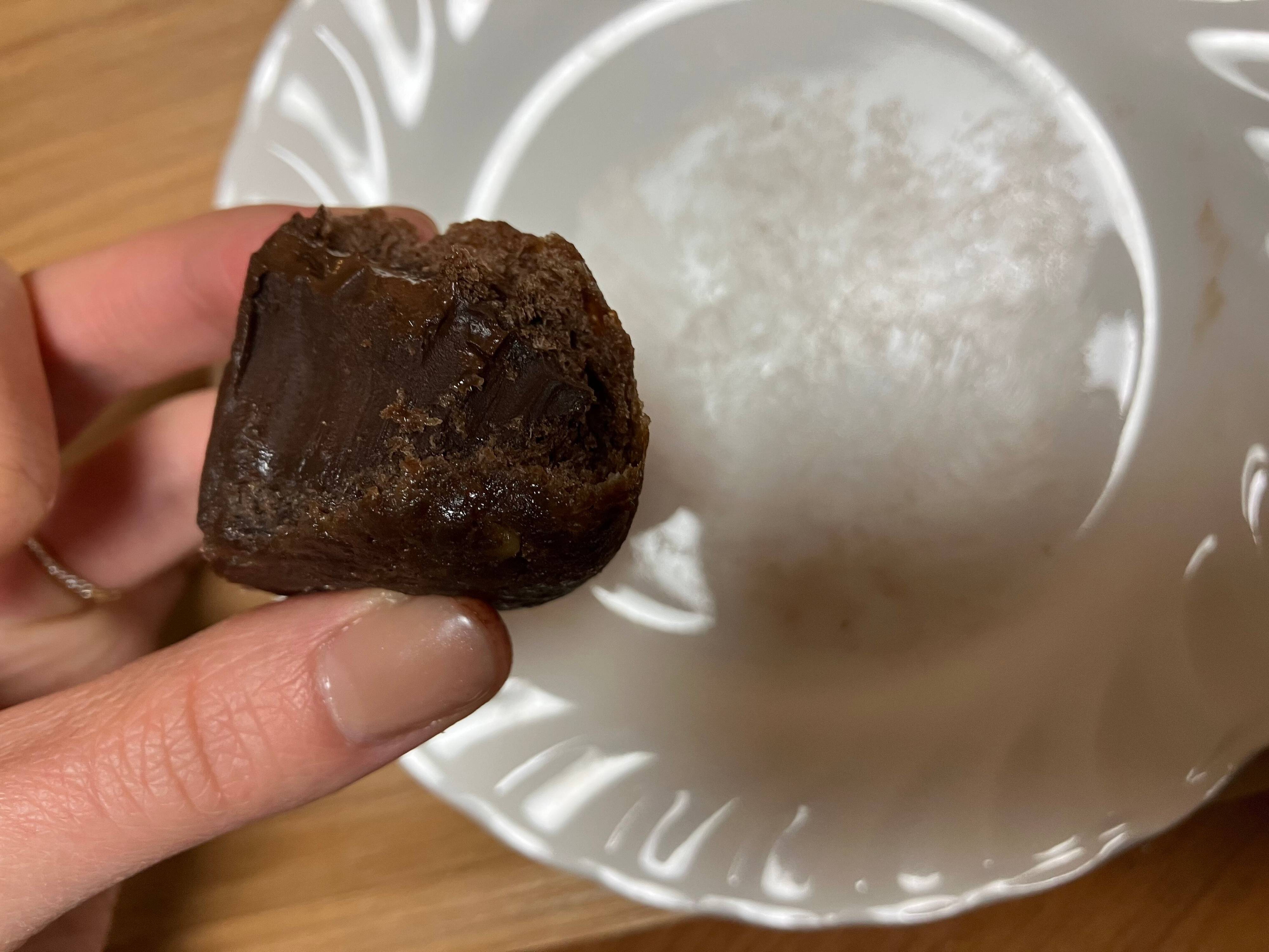 切るときに柔らかい感触を想像していたのですが、意外と硬くてびっくり。理由は中にチョコがずっしりと詰まっているからです。GODIVAとのコラボで、このチョコの量は期待できそうですね。