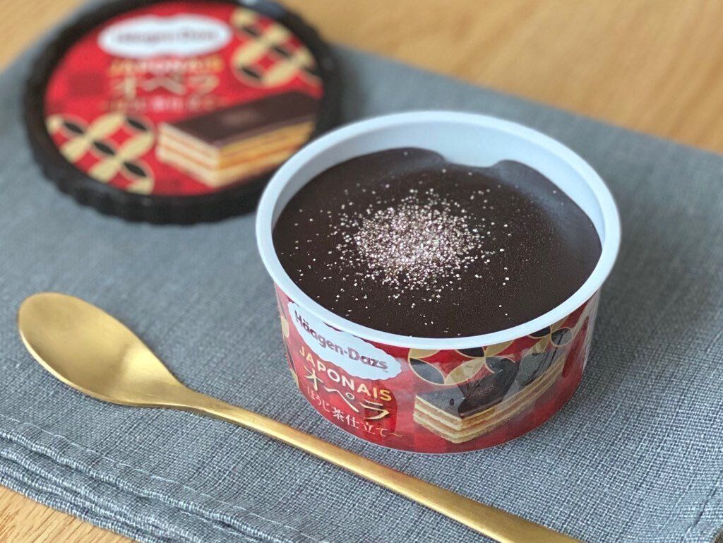 バタークッキーを混ぜ込んだバタースカッチアイスの上に、濃厚な味わいのキャラメルソース、ほうじ茶アイスを重ね、天面にはチョコレートソースと銀粉シュガーをトッピング。フランス発祥のケーキ「オペラ」をハーゲンダッツならではの味わいで表現したそう。