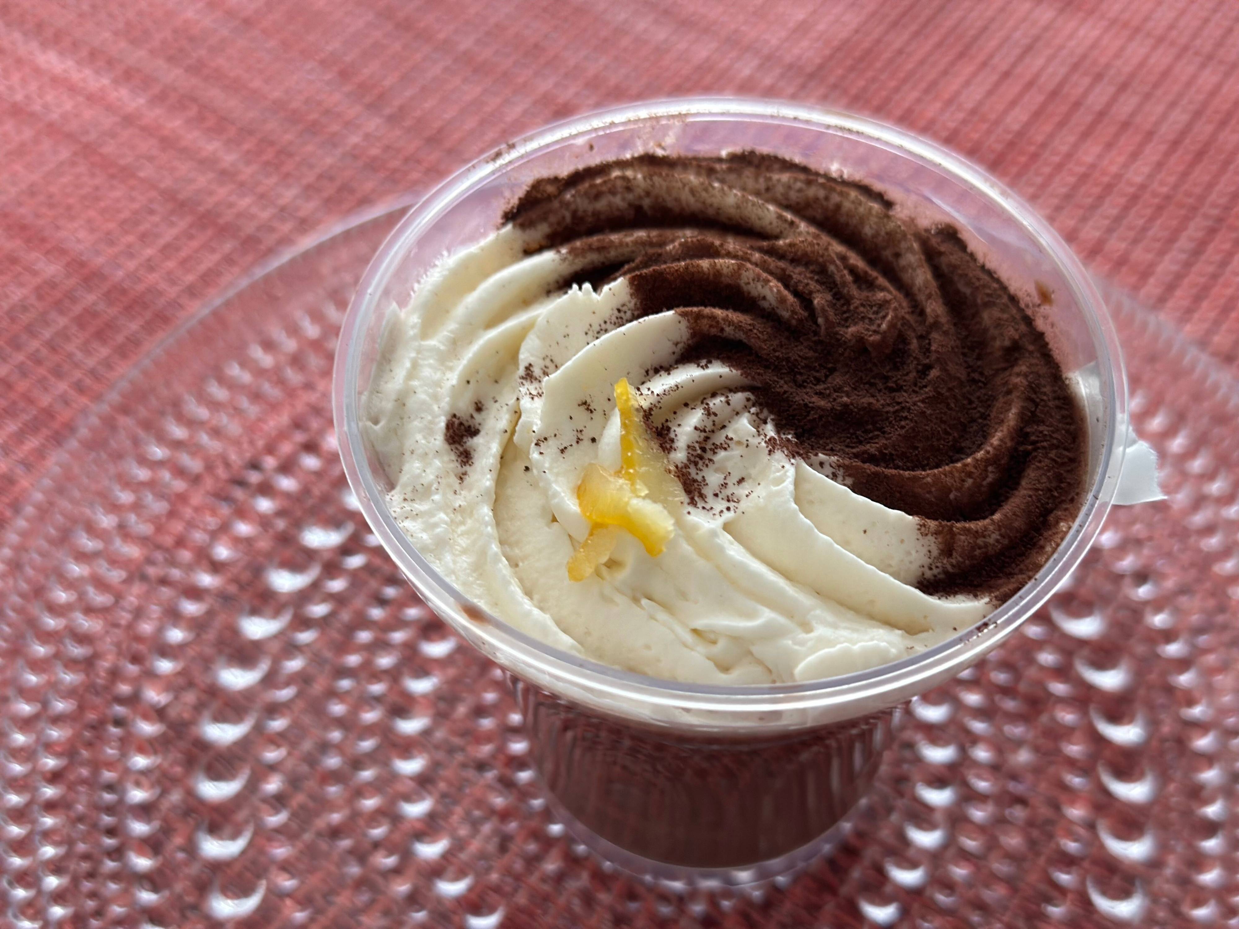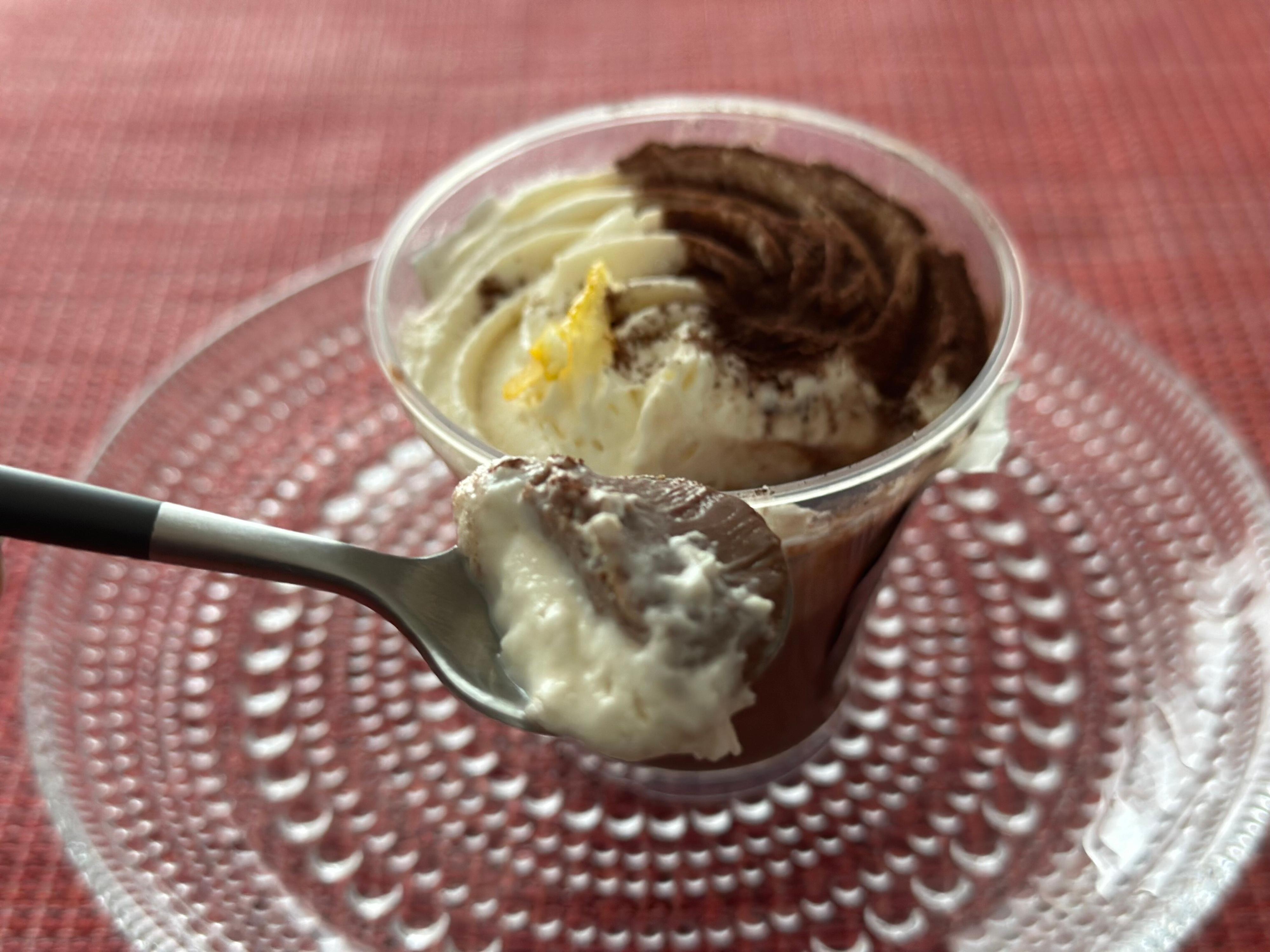 上部のホイップクリームとプリンの間にはパリシャリ食感の削りチョコも入っており、ふわふわホイップとなめらかショコラムースの柔らかい食感の中で良いアクセントになっています。
