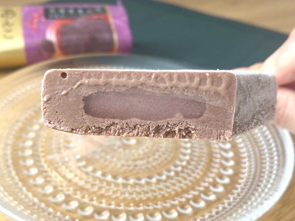 外側のチョコレートアイスはシャリっと音をたてて、口に入るとスーッと溶けていきます。程よい甘さでカカオのビターな味わいを楽しめます。