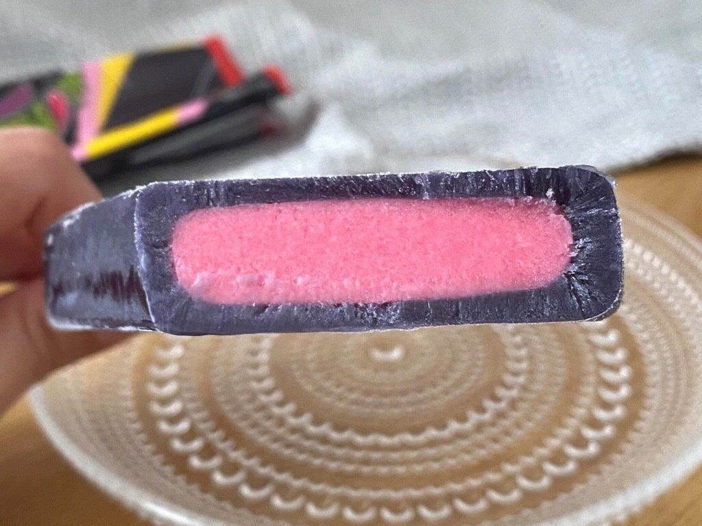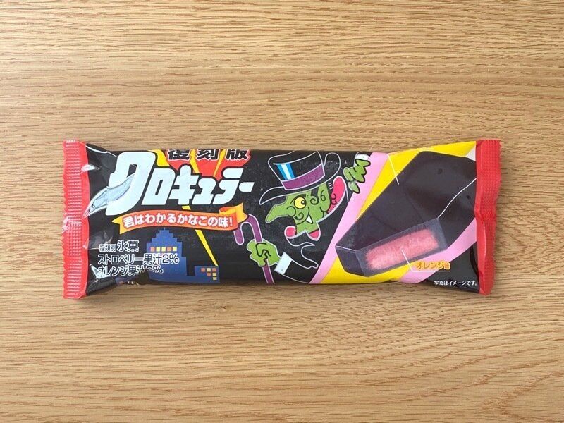 開封してまず驚いたのは色の黒さ。真っ黒なアイスバーは食べたことがないのでビックリしましたが、食べてみるとしっかりストロベリー味。中のオレンジ味と混ざり合うと一気に爽やかさが増します。見た目のイメージとは真逆のサッパリとした味わいで、どこか懐かしさも感じます。