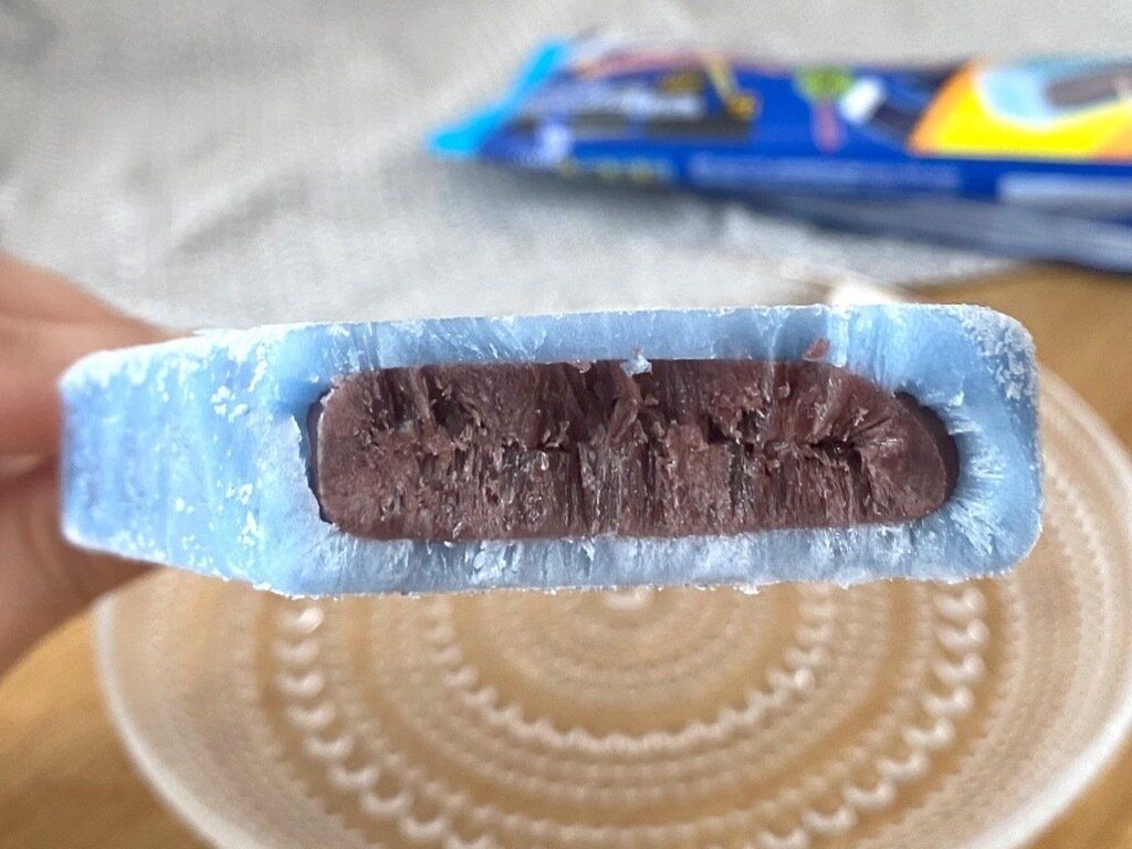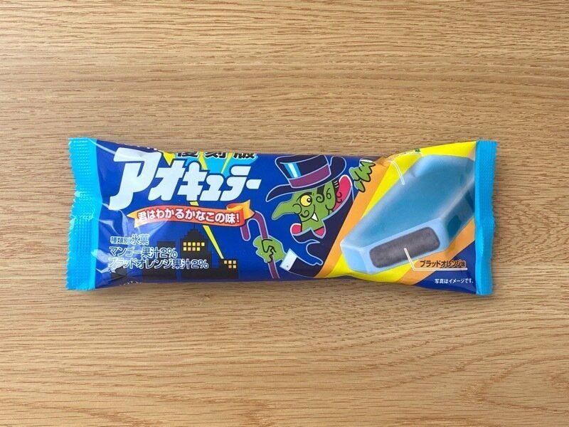 外側はマンゴー味、中はブラッドオレンジ味の2層になったアイスバーです。「クロキュラー」はオレンジ味ですが「アオキュラー」はブラッドオレンジ味。カロリーが「アオキュラー」の方が33kcalも低いことに驚きます。