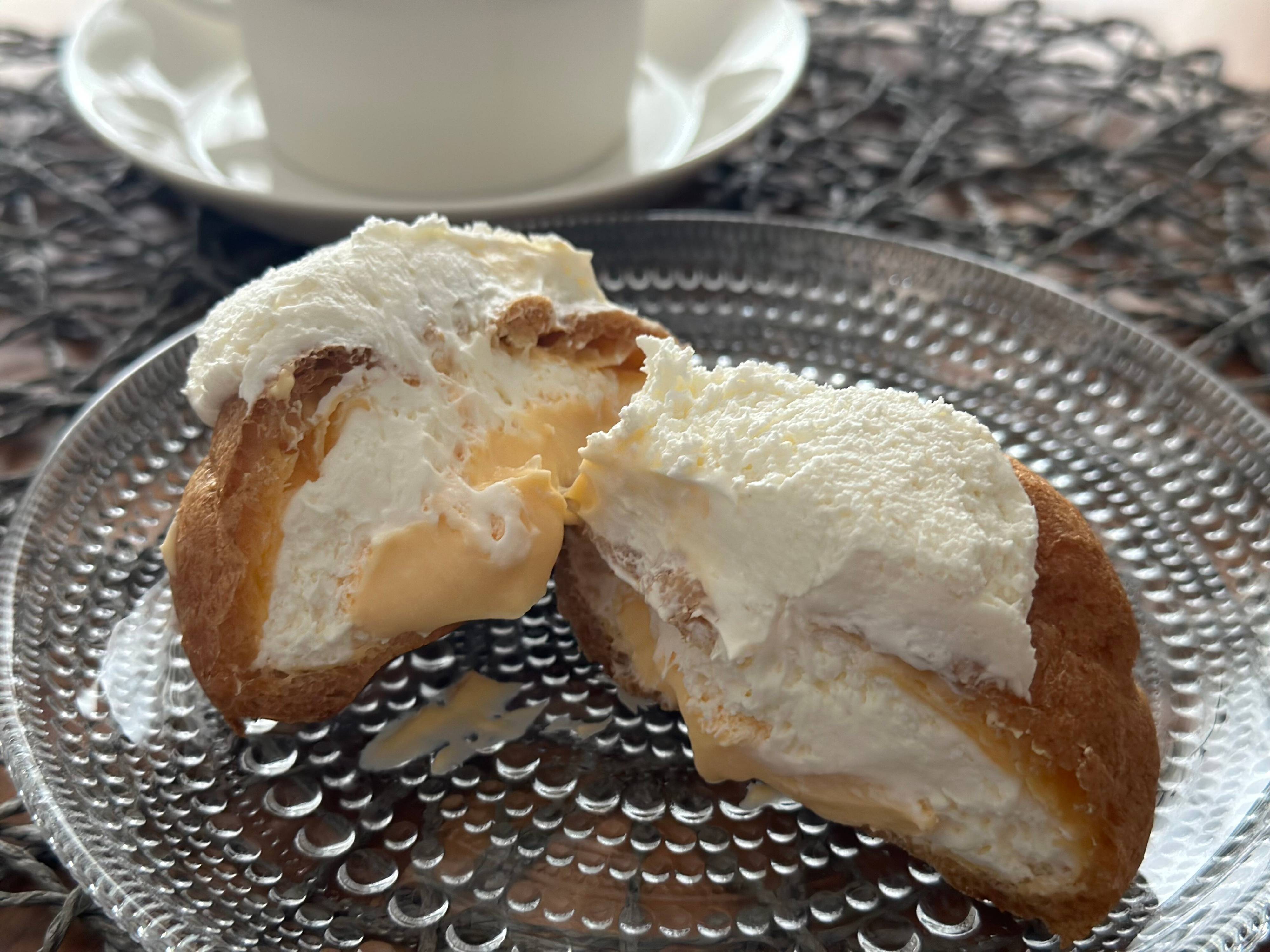 シュー生地の中だけでなく外側にまでクリームがモリモリのビジュアルがインパクト大な新作スイーツ。クリーム好きにはたまらない一品!早速ご紹介していきます。