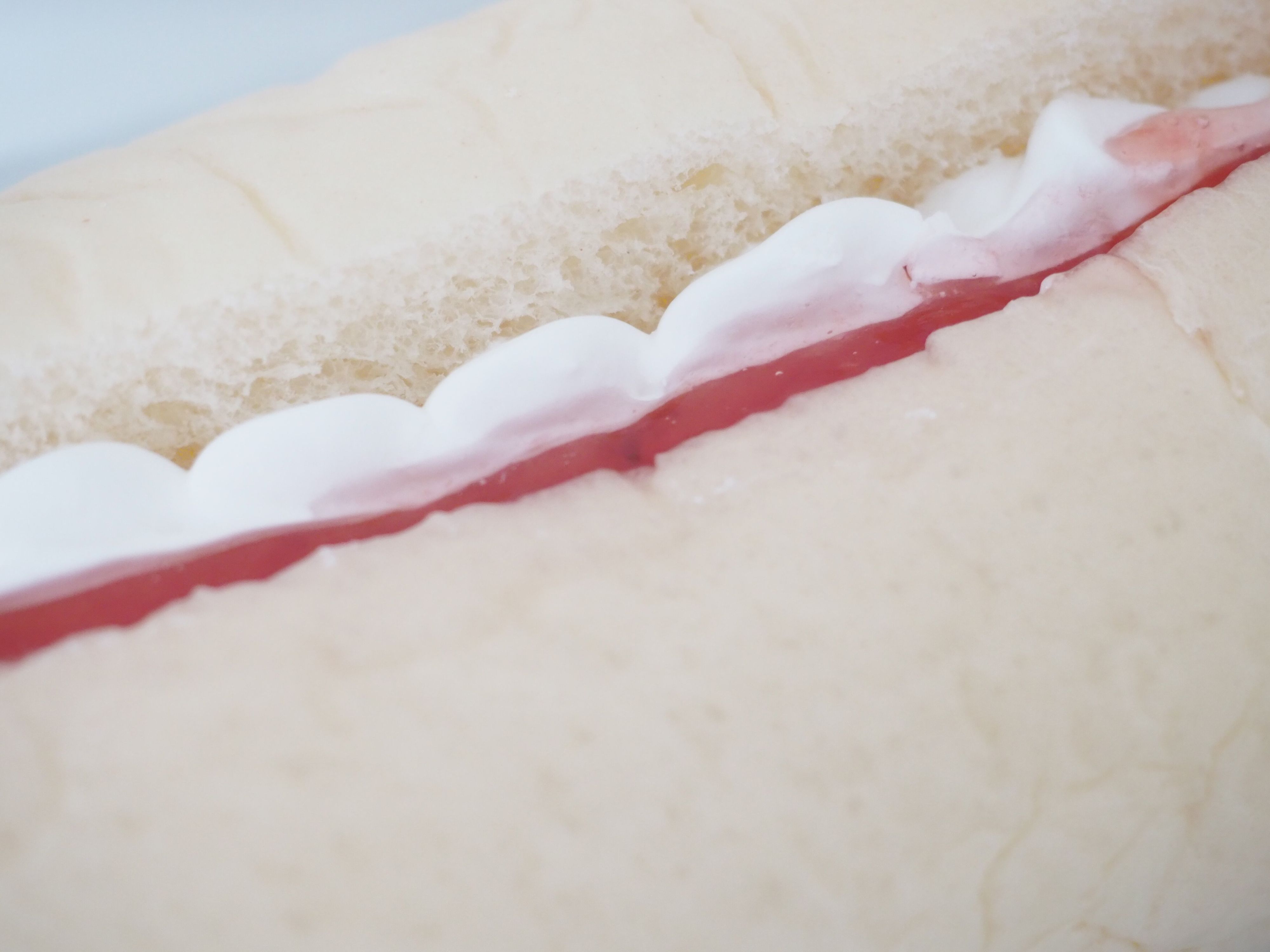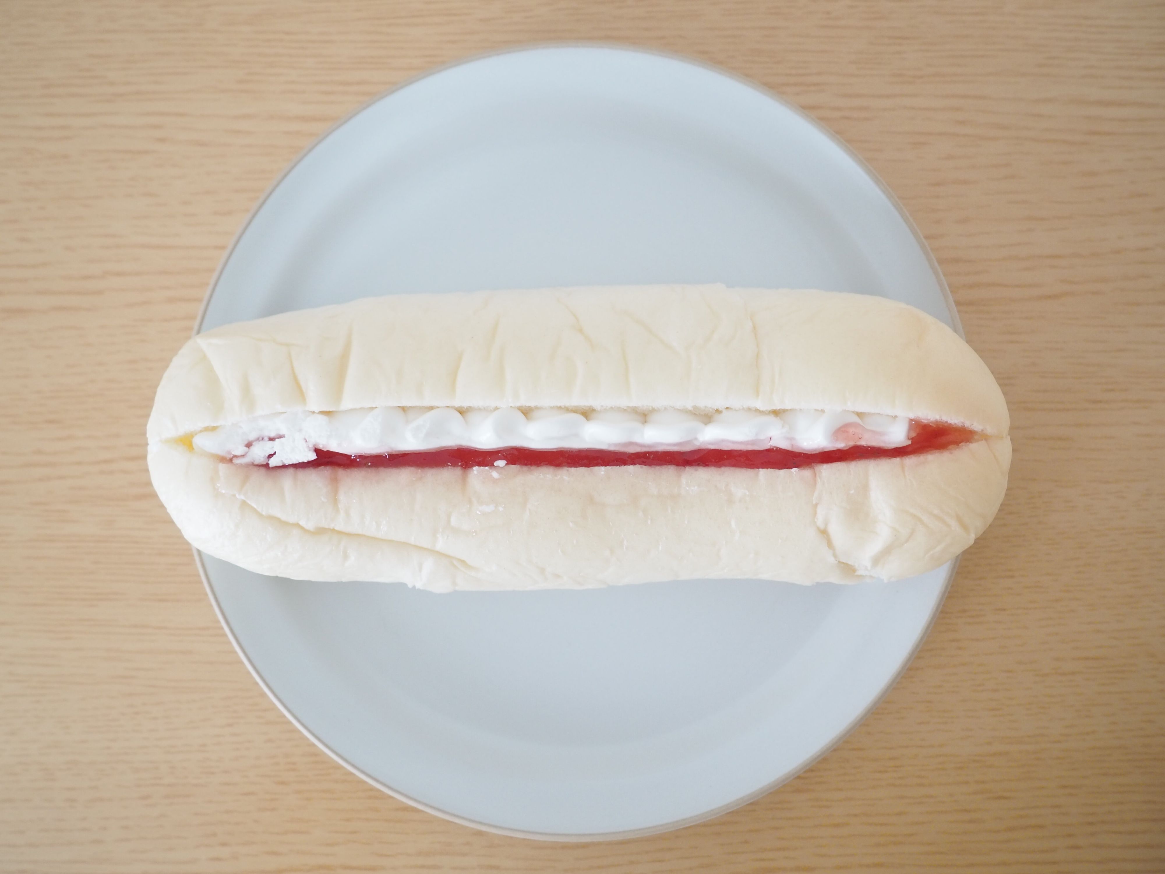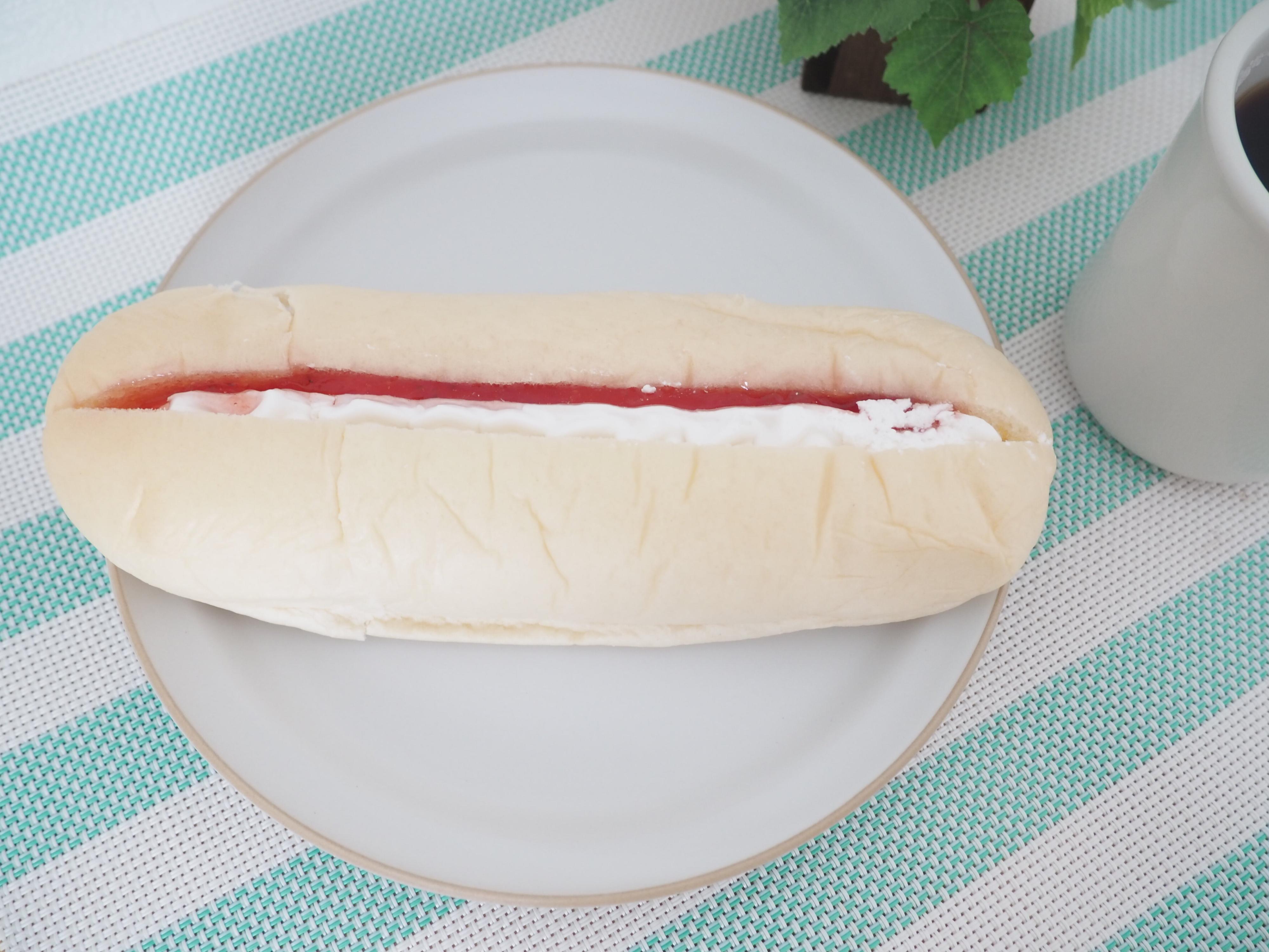 早速開封してみます。白くて長いロールパンに切り込みが入っていて、そこにミルクホイップといちごジャムがサンドされています。