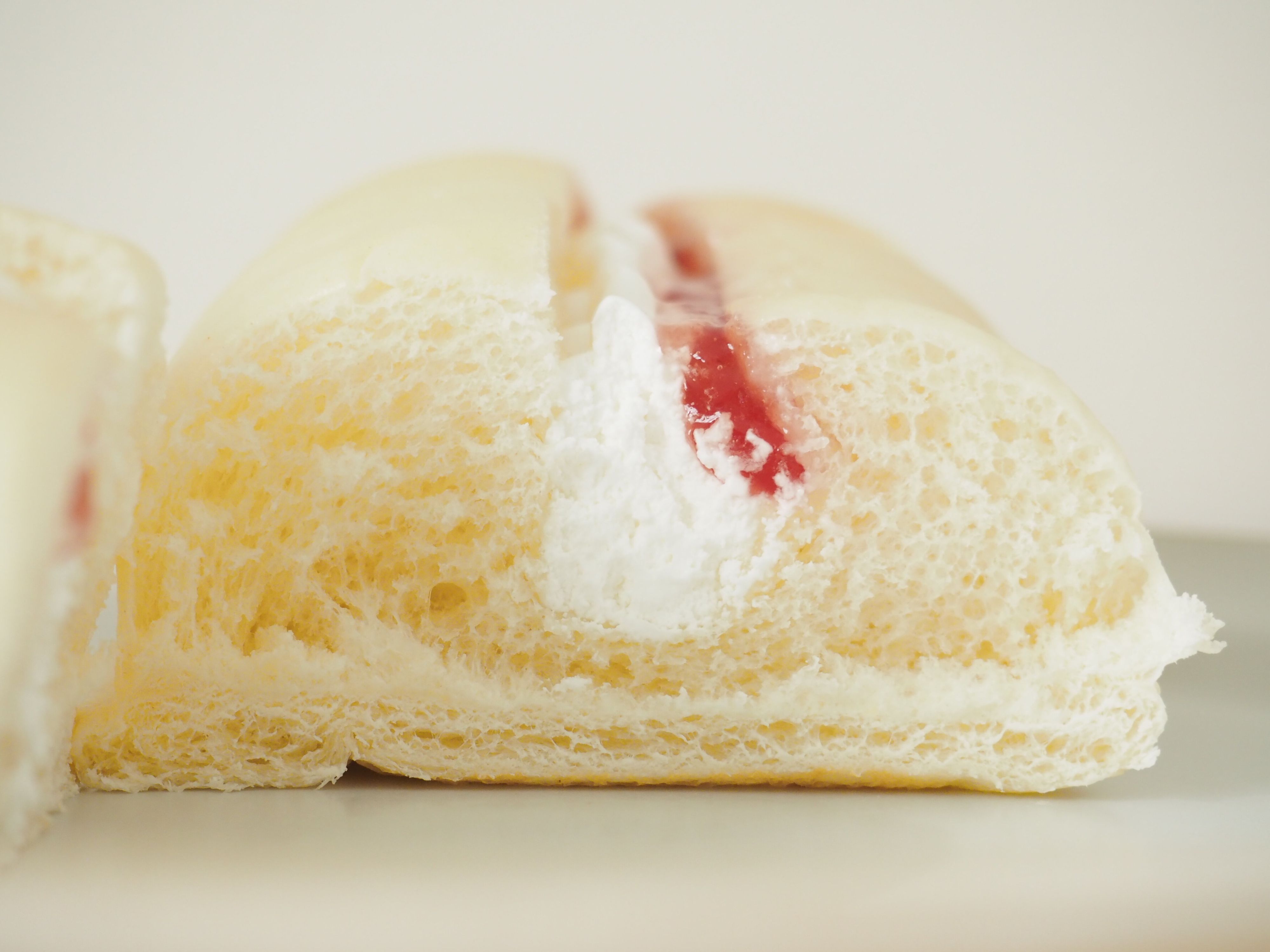 ミルクホイップはなかなか硬めで、甘党好みの甘さ。それが奥までたっぷり詰まっているのがうれしい…!ジャムの量があまり多くないように見えますが、実はこれがベストバランス。フルーティーな甘さと控えめの酸味がアクセントになり、まるで本当にショートケーキを食べているよう!