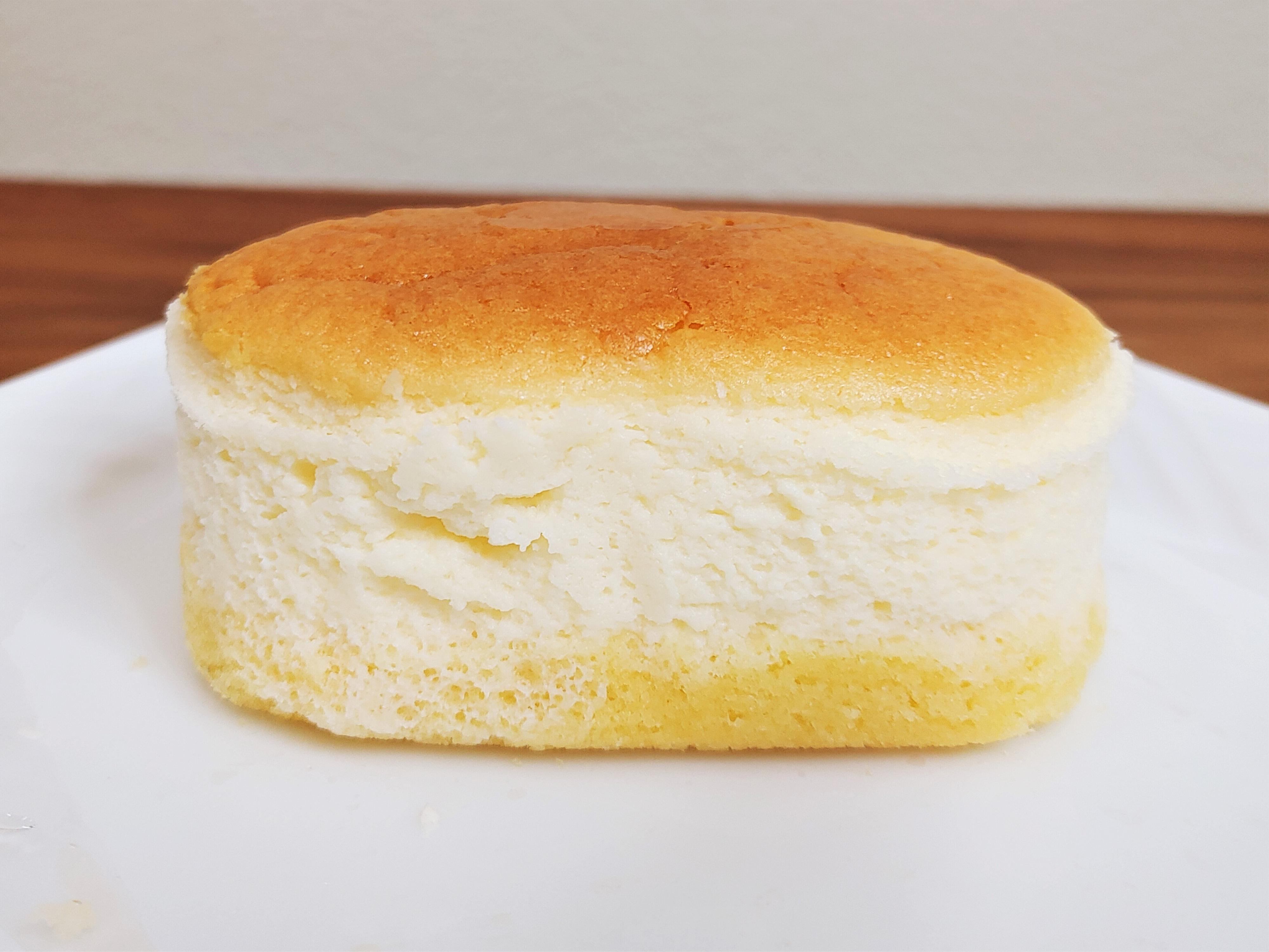 サイズは手のひらに収まる小ぶりな作り。底にスポンジ生地、その上にスフレチーズケーキという2層構造で至ってシンプルです。