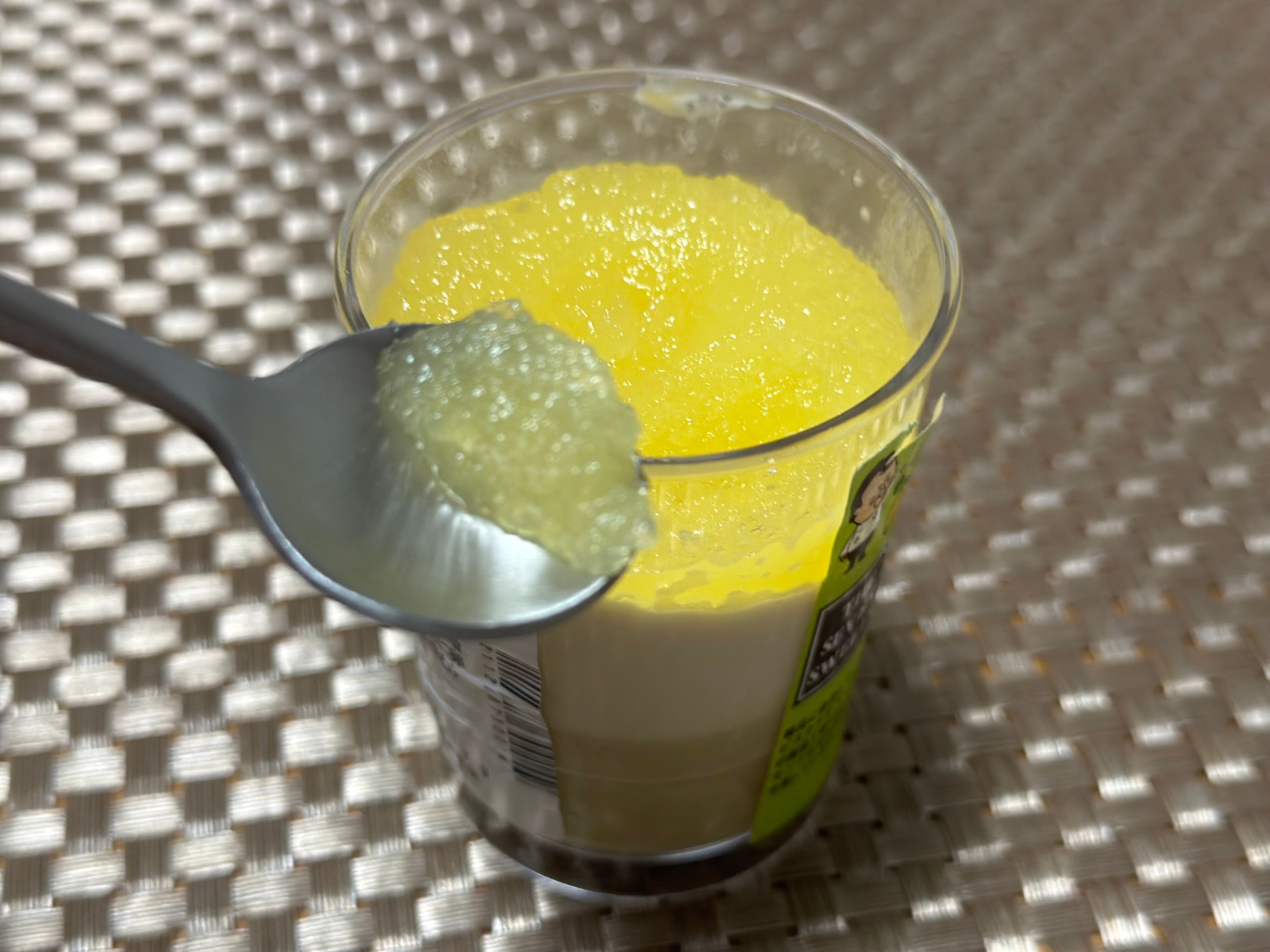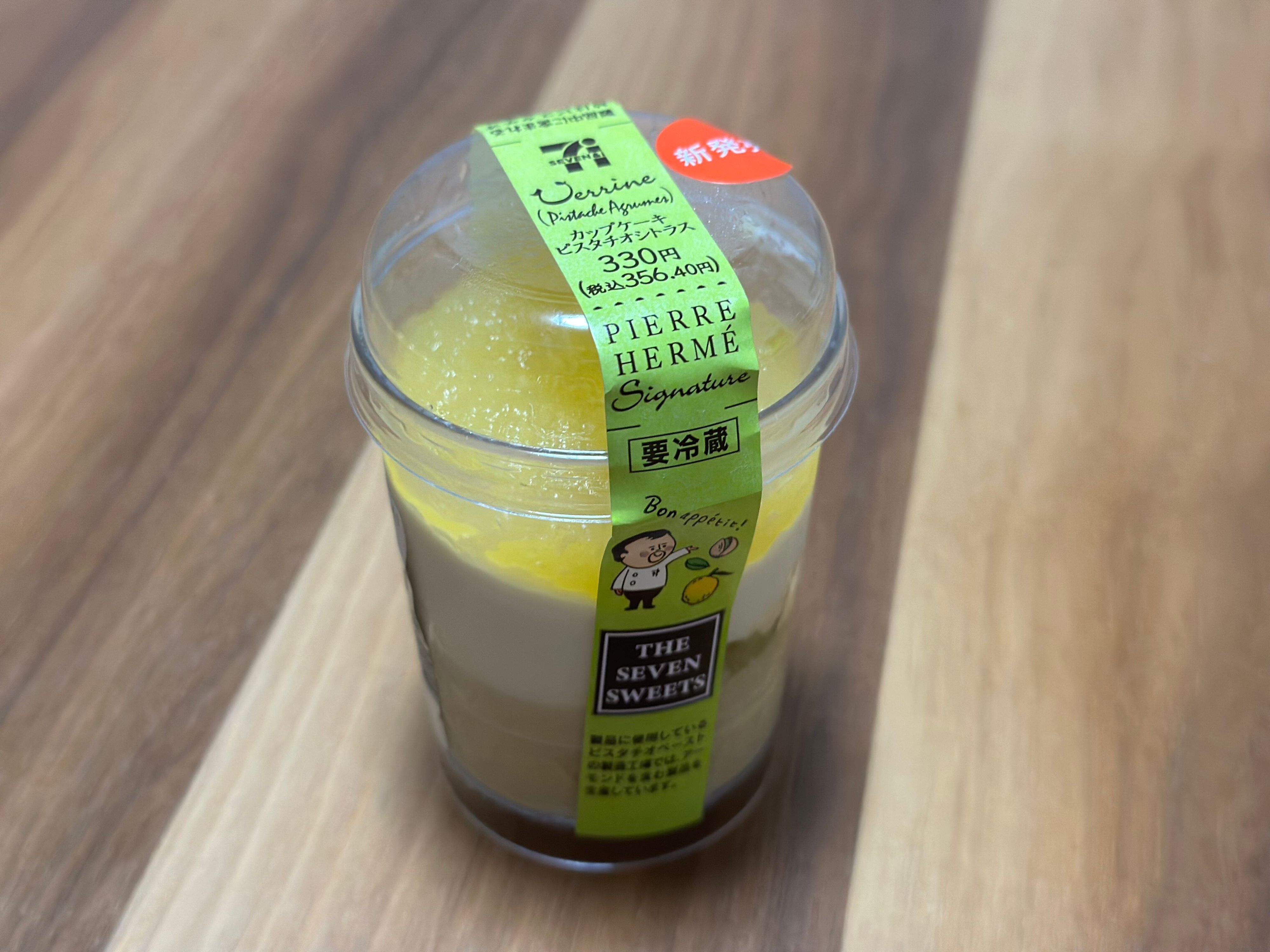 シトラスとピスタチオの淡いグリーン系のカラーがなんとも上品で美しいビジュアル。上から順に「シトラスジュレ」「ピスタチオチーズクリーム」「ピスタチオブリュレ」の3層仕立てのカップケーキです。値段は356円。