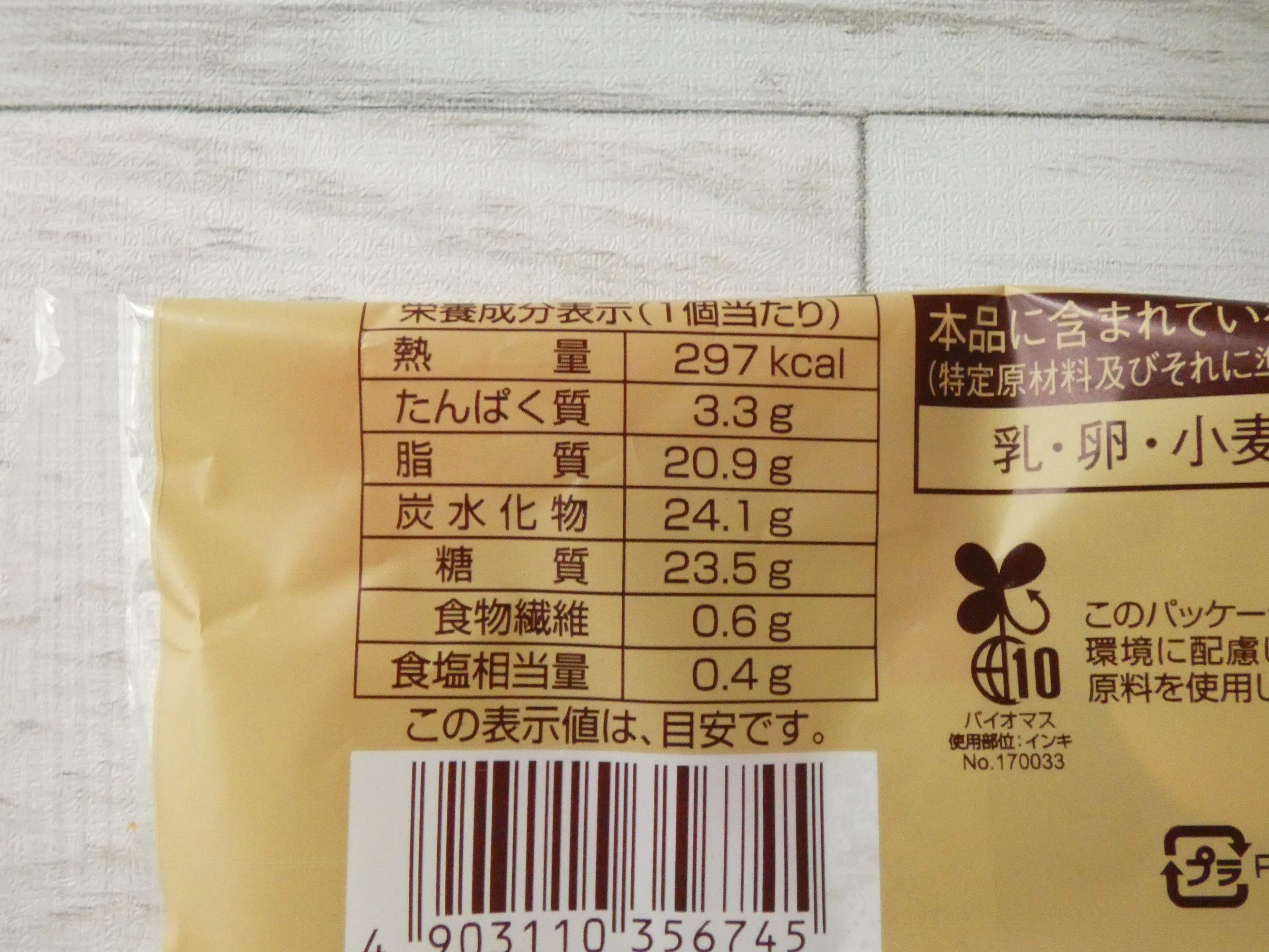 栄養成分表示を見ると1個のエネルギーは297kcal。デニッシュにクリーム入りなので、かなり高カロリーのはずと予想していましたが、思ったほどではなかったです。
