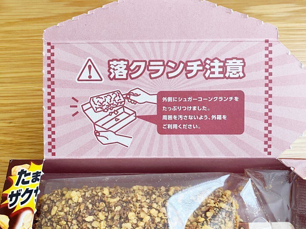 箱の外側と内側にも記載がありますが、クランチが想像以上にこぼれるので食べる時は注意が必要。