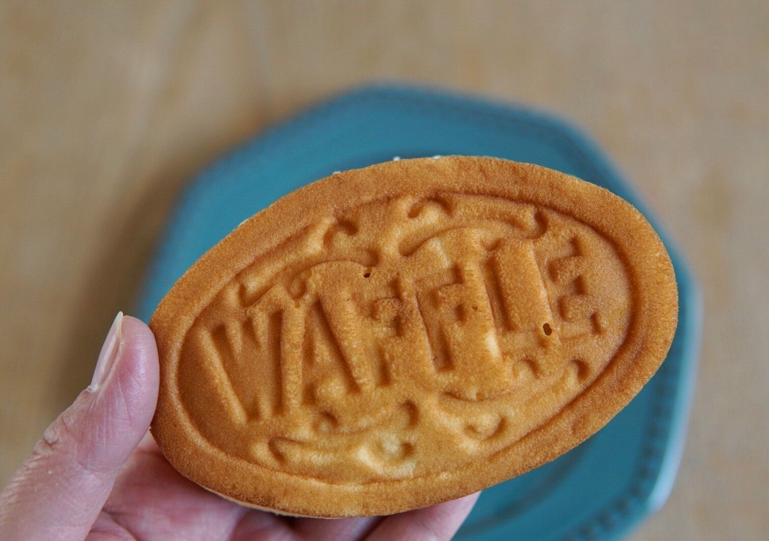 袋を開けて手に持ってみると、生地のふんわり感を感じます。焼き色もほどよく、表面に刻印された「WAFFLE」の文字やデザインがオシャレで、シンプルな中にも映え要素が。