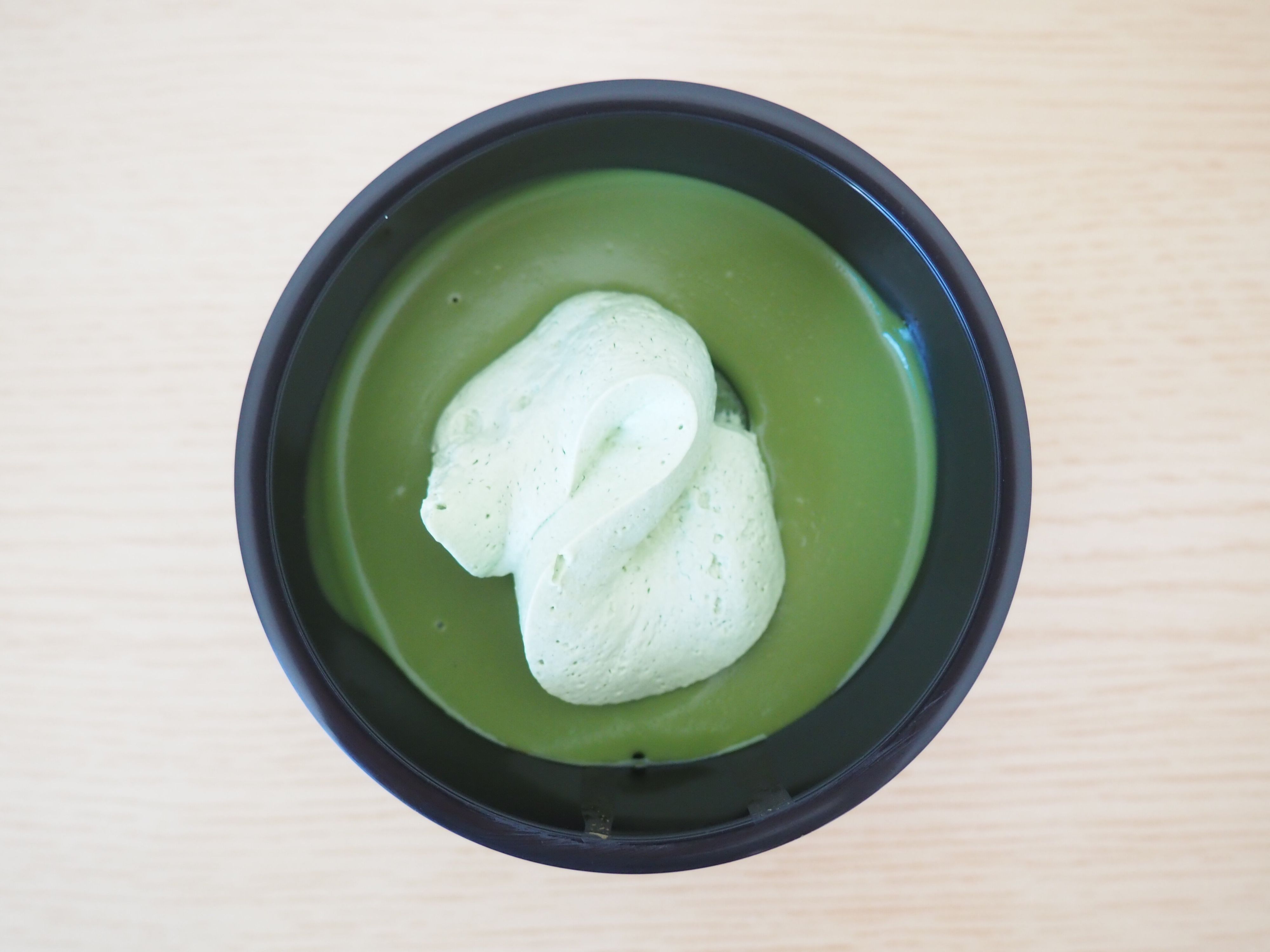 ふたを開けてみると目に飛び込むのは、濃い抹茶色。見るからに風味も良さそうですね!中心にある抹茶ホイップにも興味をそそられます。
