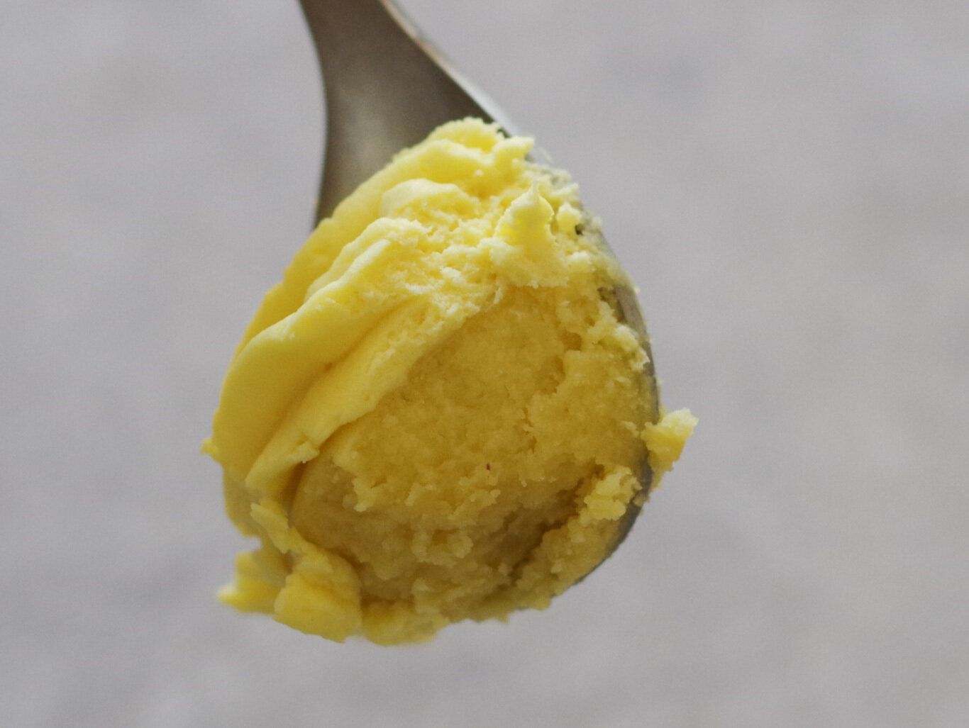 上の部分は生スイートポテト、下はねっとりした焼きスイートポテトの2層になっています。上はムースのように、ふわっと軽くなめらかな食感が楽しめます。個人的には、下の濃厚でねっとりとした焼きスイートポテトの味わいが好みで!