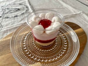 開封してみると、カヌレは透明のトレイに入っていることがわかりました。カヌレの中心に添えられたチョコレートクリームはセロハンで保護されているので、見た目もきれいに保たれています。