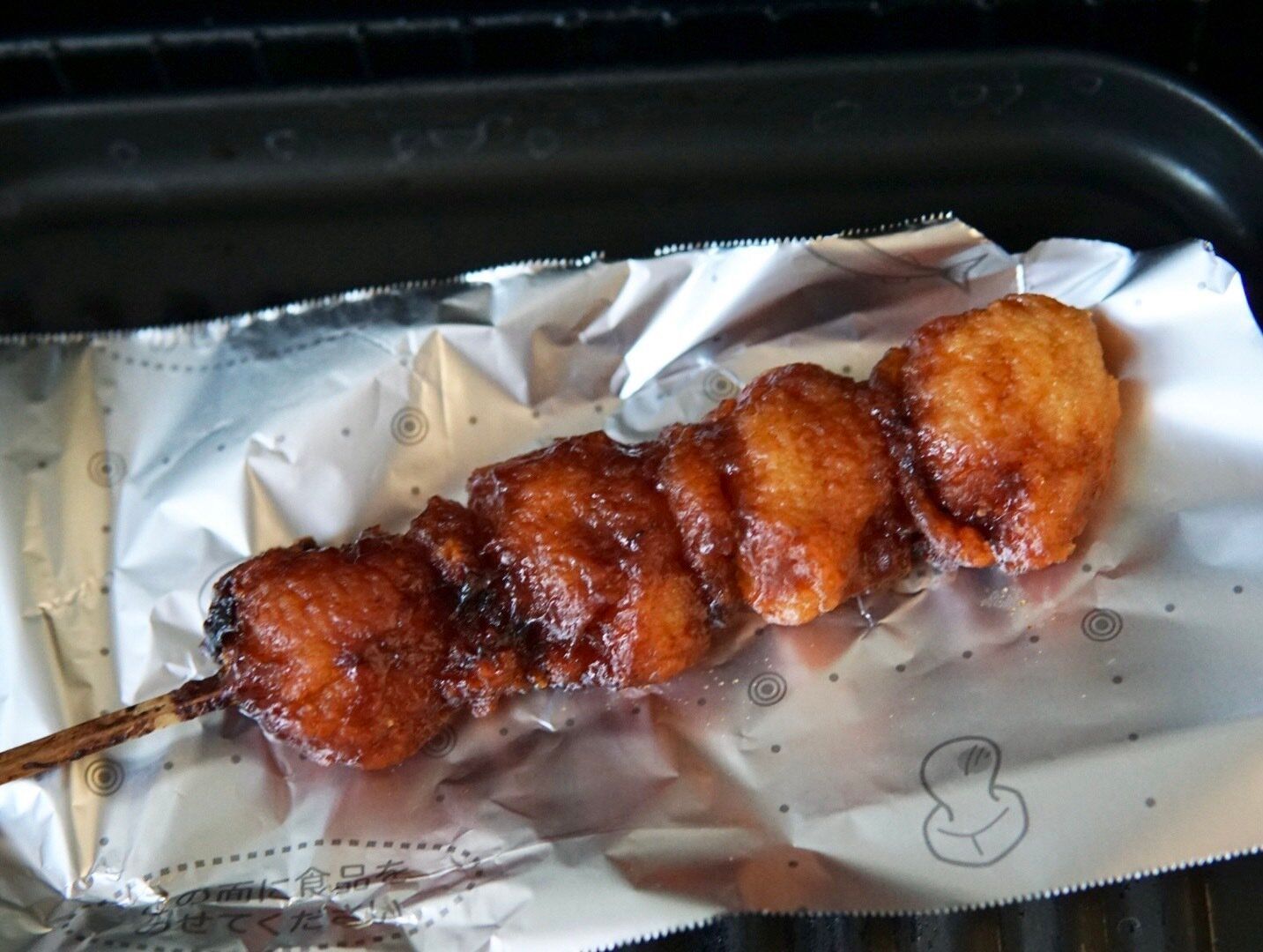 今回は、「タレから棒」つまりは、ヤンニョム味のタレがかかった唐揚げ棒が販売されています。小ぶりの唐揚げが4個串にささっており、たっぷりとタレが絡んでいるのが本当に美味しそうで思わず手にとりました。