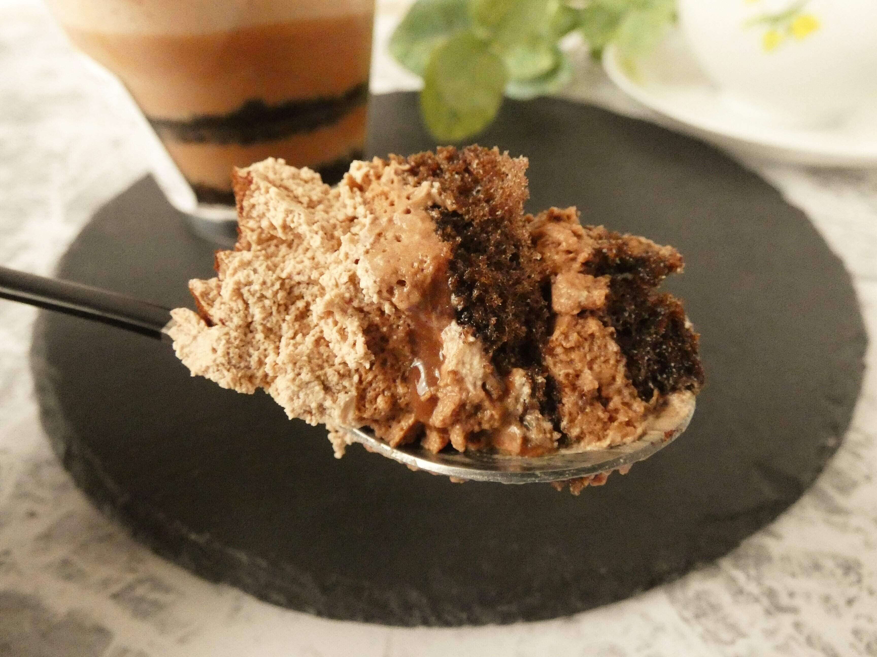一番上のチョコホイップはふんわりクリーミーで、上にかかったコーヒー入りのココアパウダーの苦みがちょうどいいです。チョコムースは濃厚でチョコソースは苦みとコクがあってとろ~り。ココアスポンジにはコーヒーシロップがたっぷり染み込んでいて、しっとりほろ苦いです。一緒に食べるといろんな味わいが広がってこれは贅沢!甘すぎず苦みも楽しめる大人スイーツはご褒美にピッタリなので、ぜひお試しください。