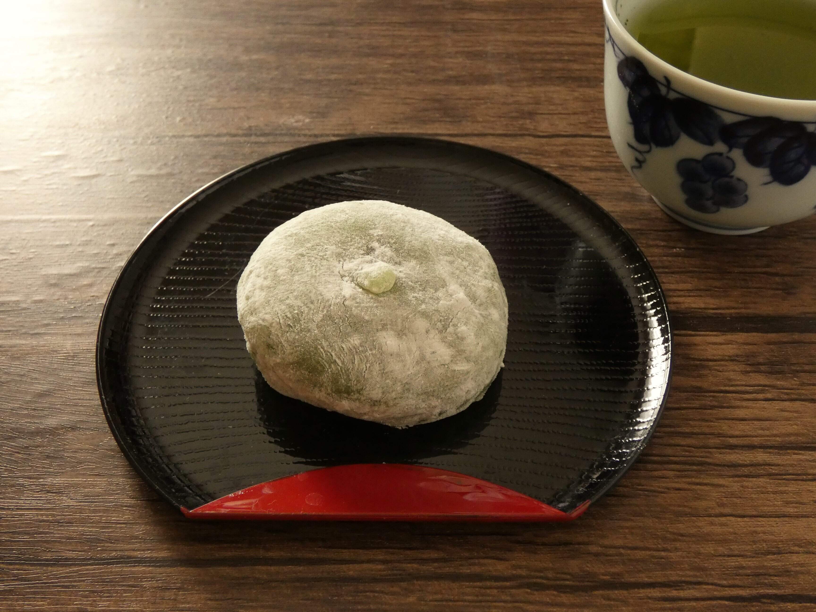 薄い緑色の餅生地に、抹茶餡とクリームが包まれています。
