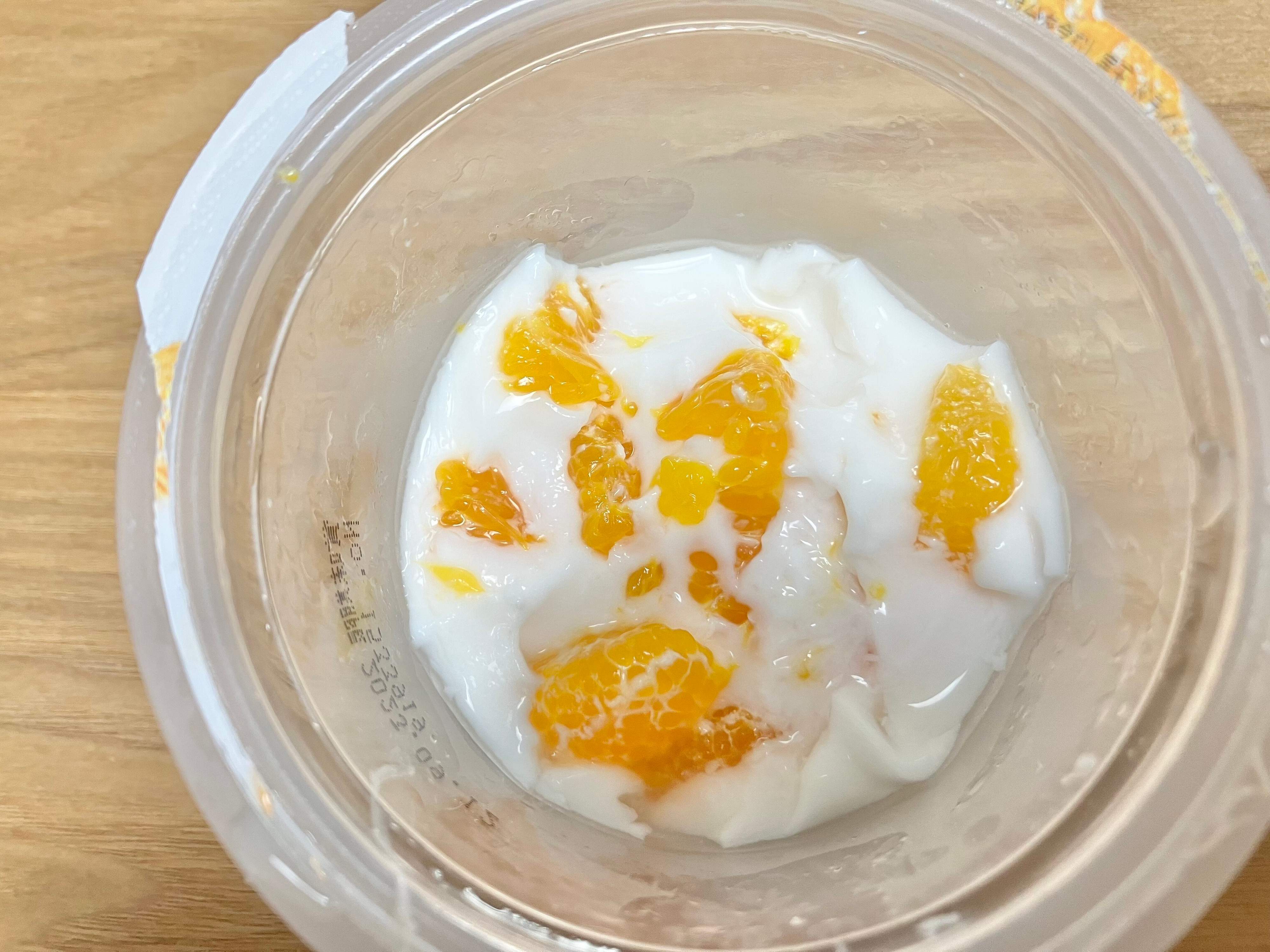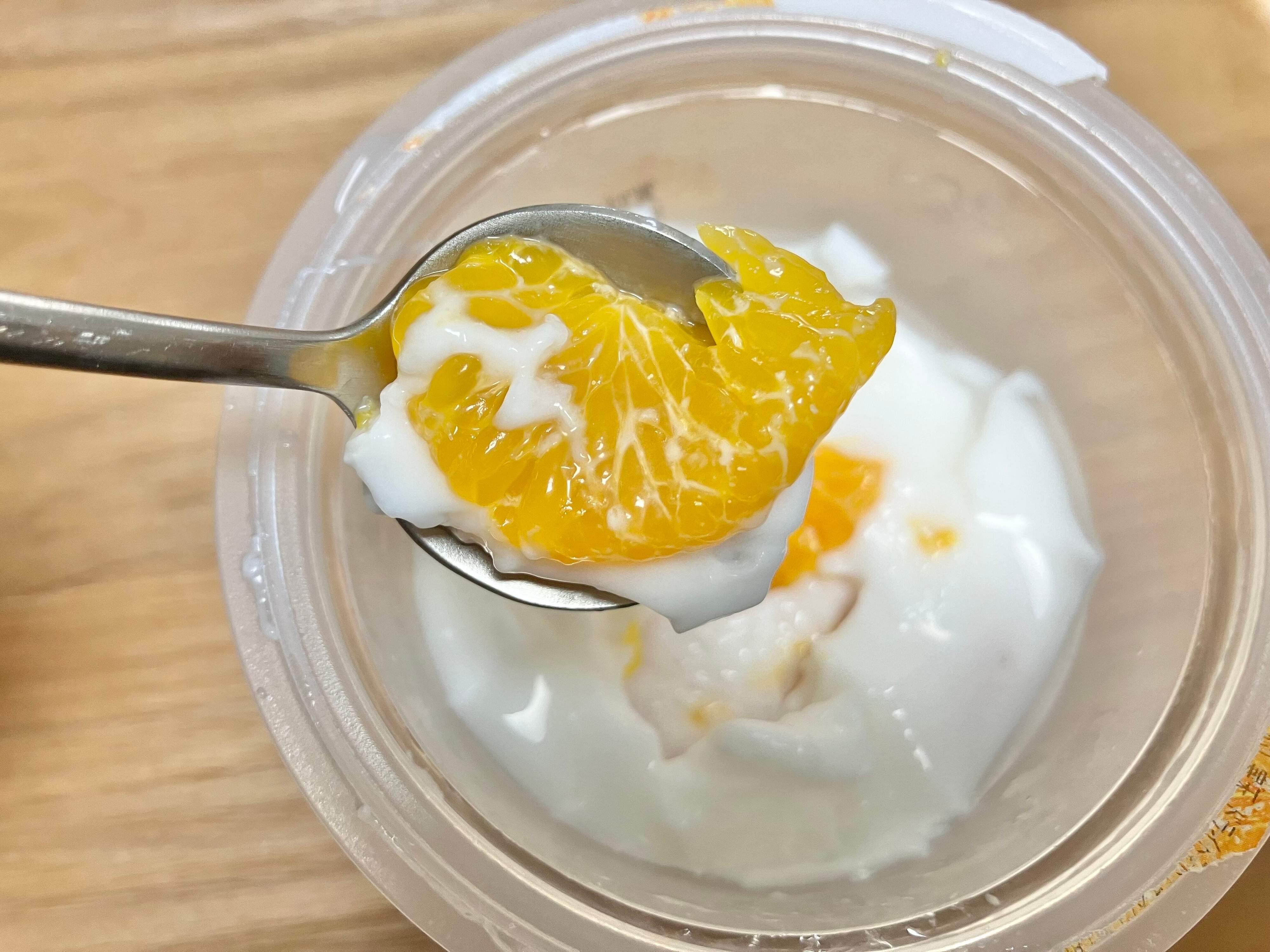 下の方には大きめのみかんがぎっしり。みかんの割合の方が多いのもあり、ミルク寒天と一緒に食べるとみかんの甘みとみずみずしさが混ざり合い、よりさっぱりとした感じになります。