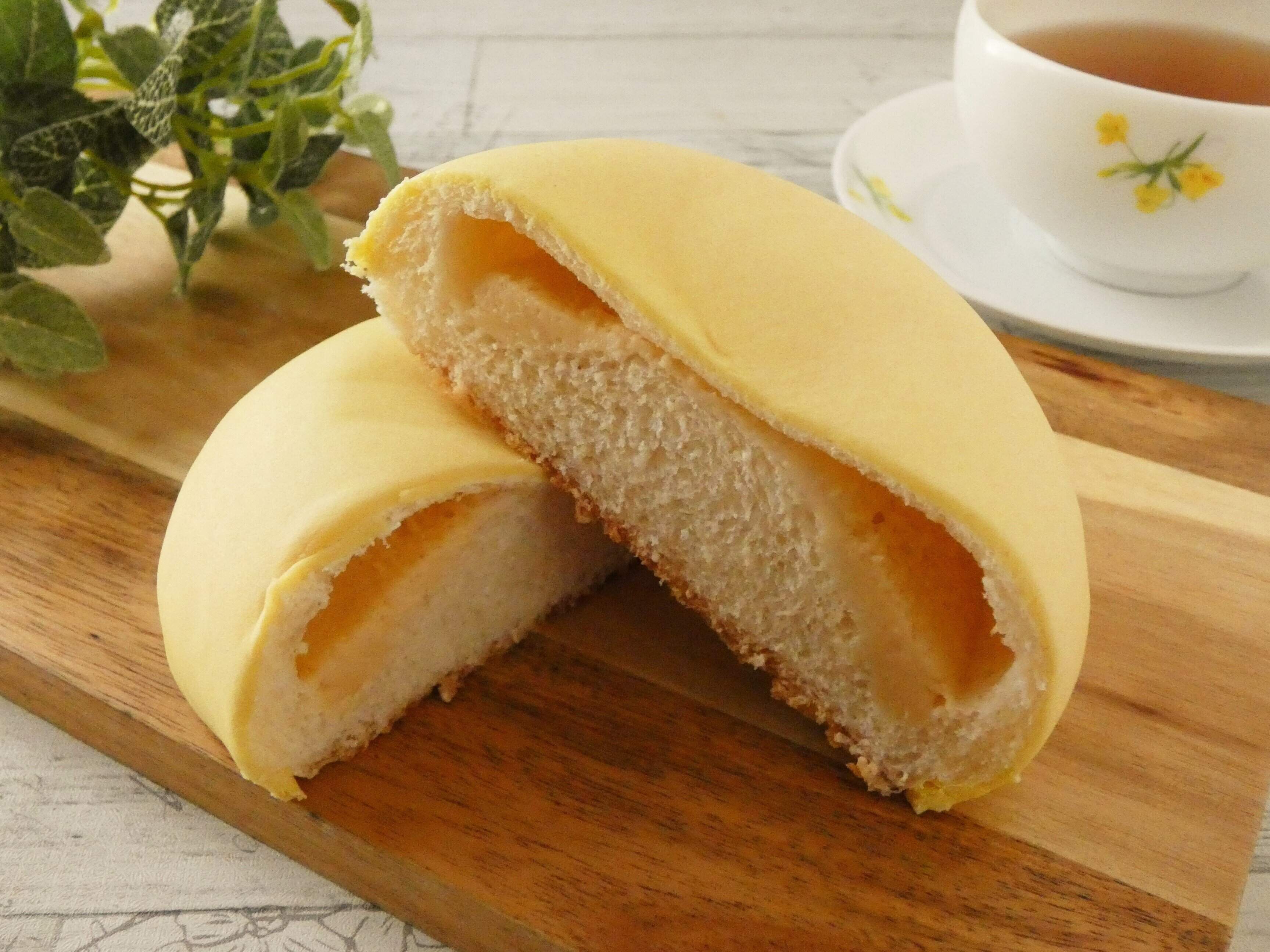 袋を開けるとバナナの香りがいっぱいに広がります。パン生地はふわっとして、表面の黄色い生地は手で持つだけでもちっと感が伝わります。カットすると中にはバナナクリームが入っていますが、それほど多くありません。ひとくち食べるとクリームが濃厚で、しっかりした甘さのねっとり食感。パン生地と一緒に食べるとバランスがよくて大満足!この量がちょうどよく感じます。