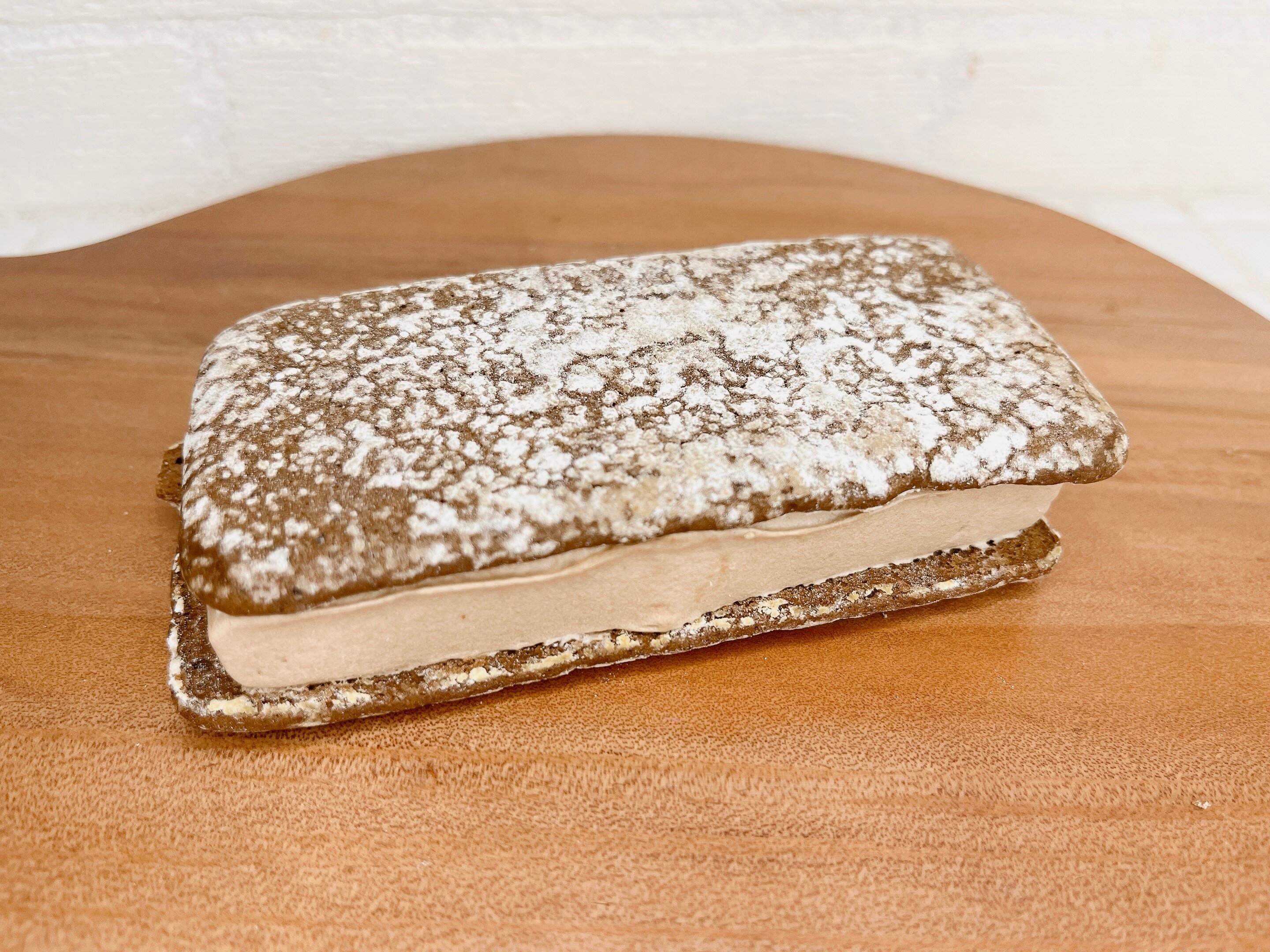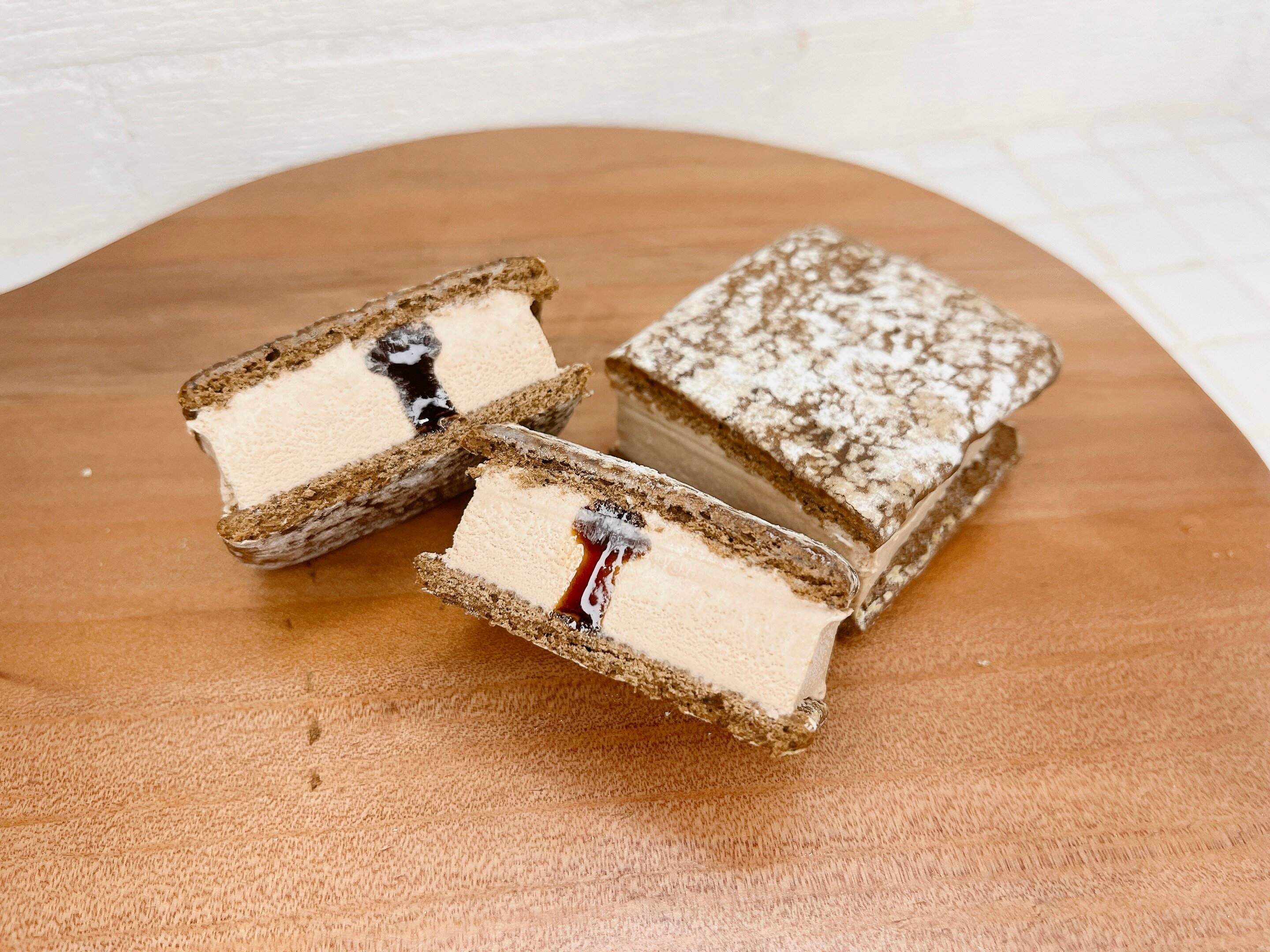 濃厚で甘い黒みつが、甘さ控えめのサンドのアクセントになりバランスのいいアイスサンドに仕上がっています。