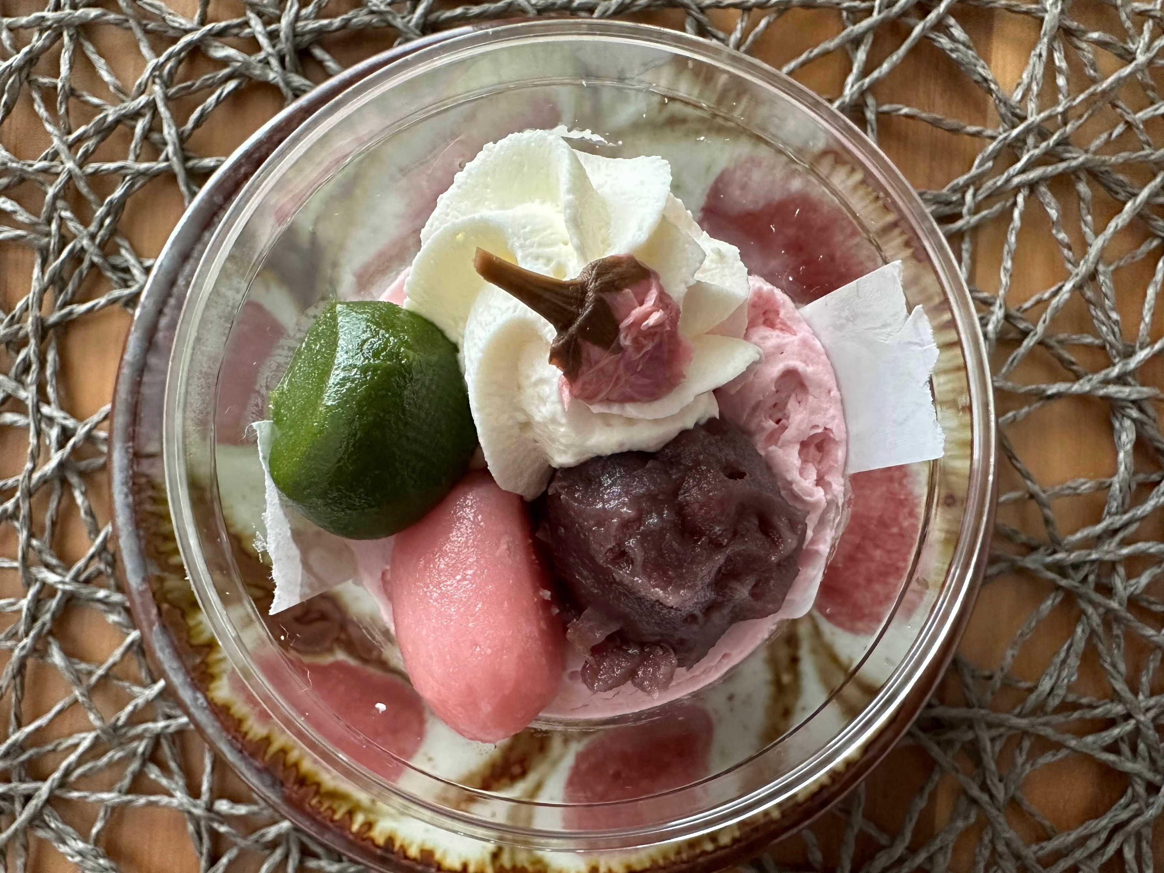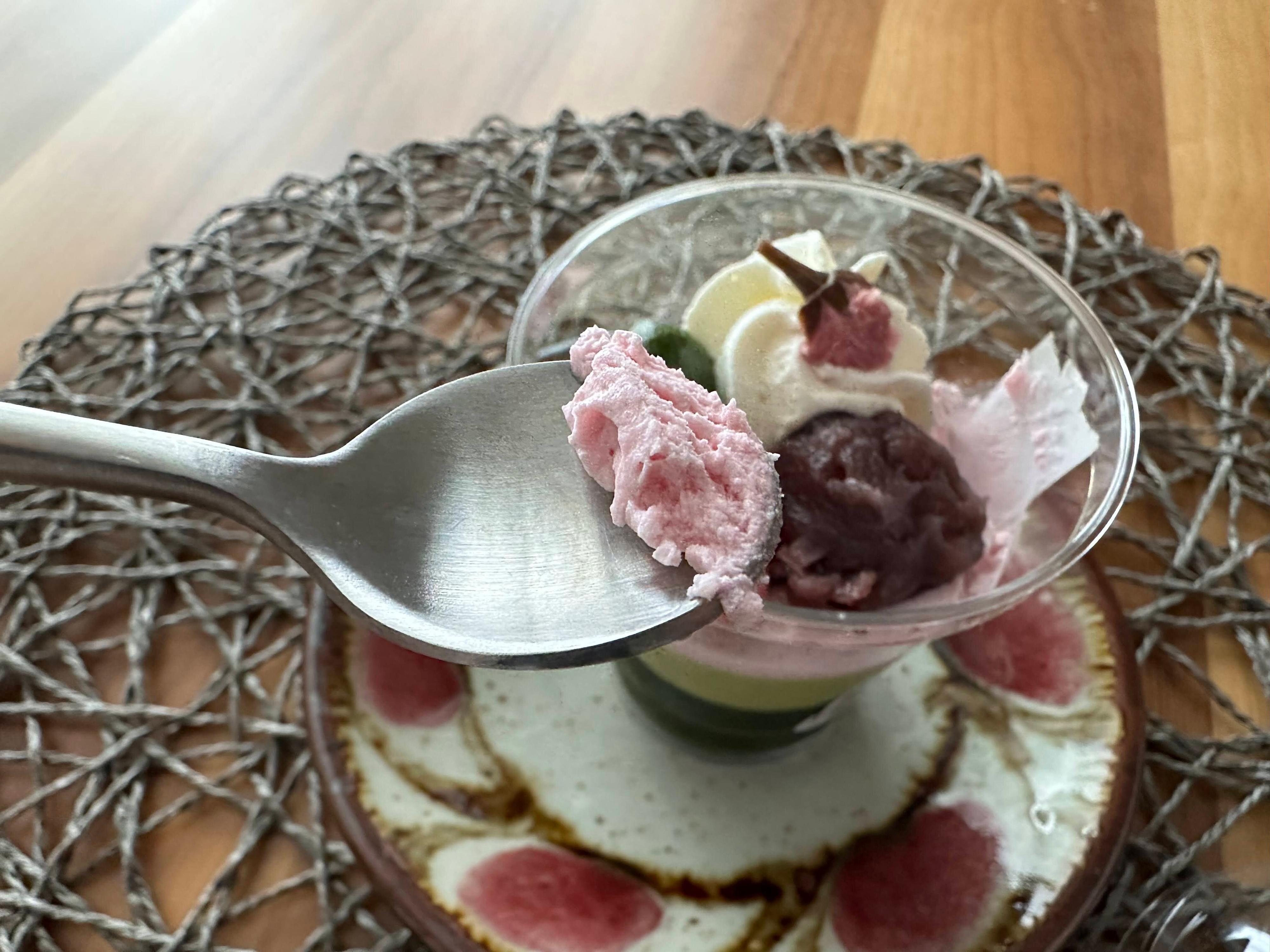 パフェのトップには茶団子、桜団子、粒餡、そしてホイップの上には桜の塩漬けがトッピングされており、見た目にも華やかなビジュアルに思わずウットリ。