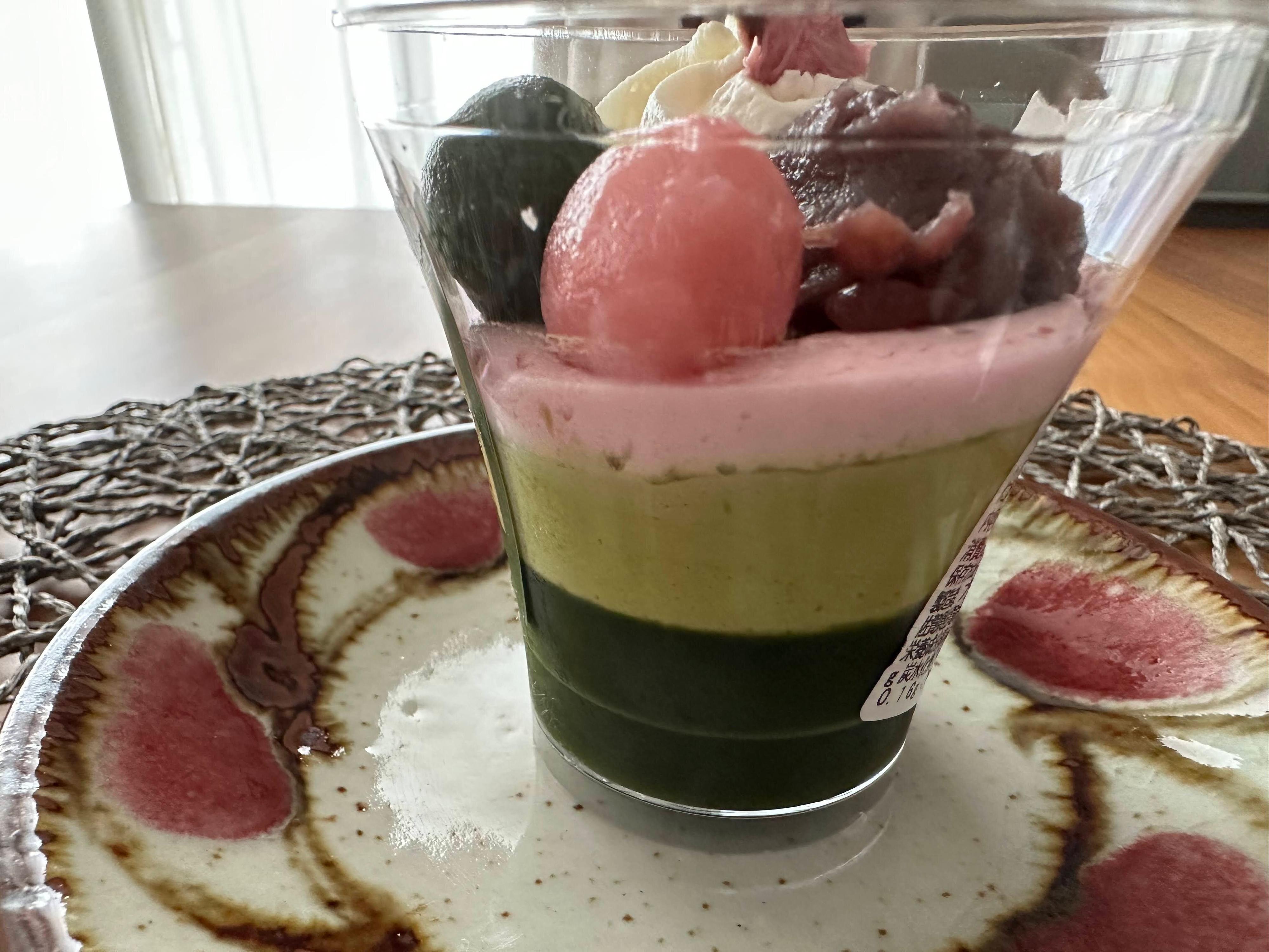 さらに横から見てみると、上からさくら餡ホイップ、宇治抹茶ムース、宇治抹茶ゼリーの、なんとも贅沢な3層仕立て。
