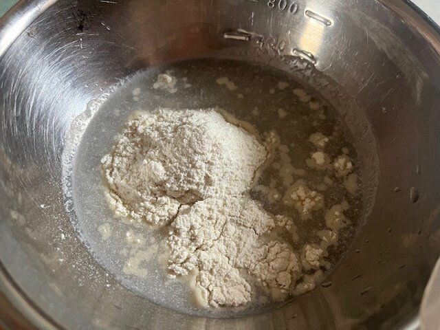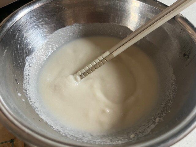 水を入れた直後は混ぜてもずっとこんな感じで、天ぷら粉ぐらいの固さでした。あれ?これで大根餅になるの?