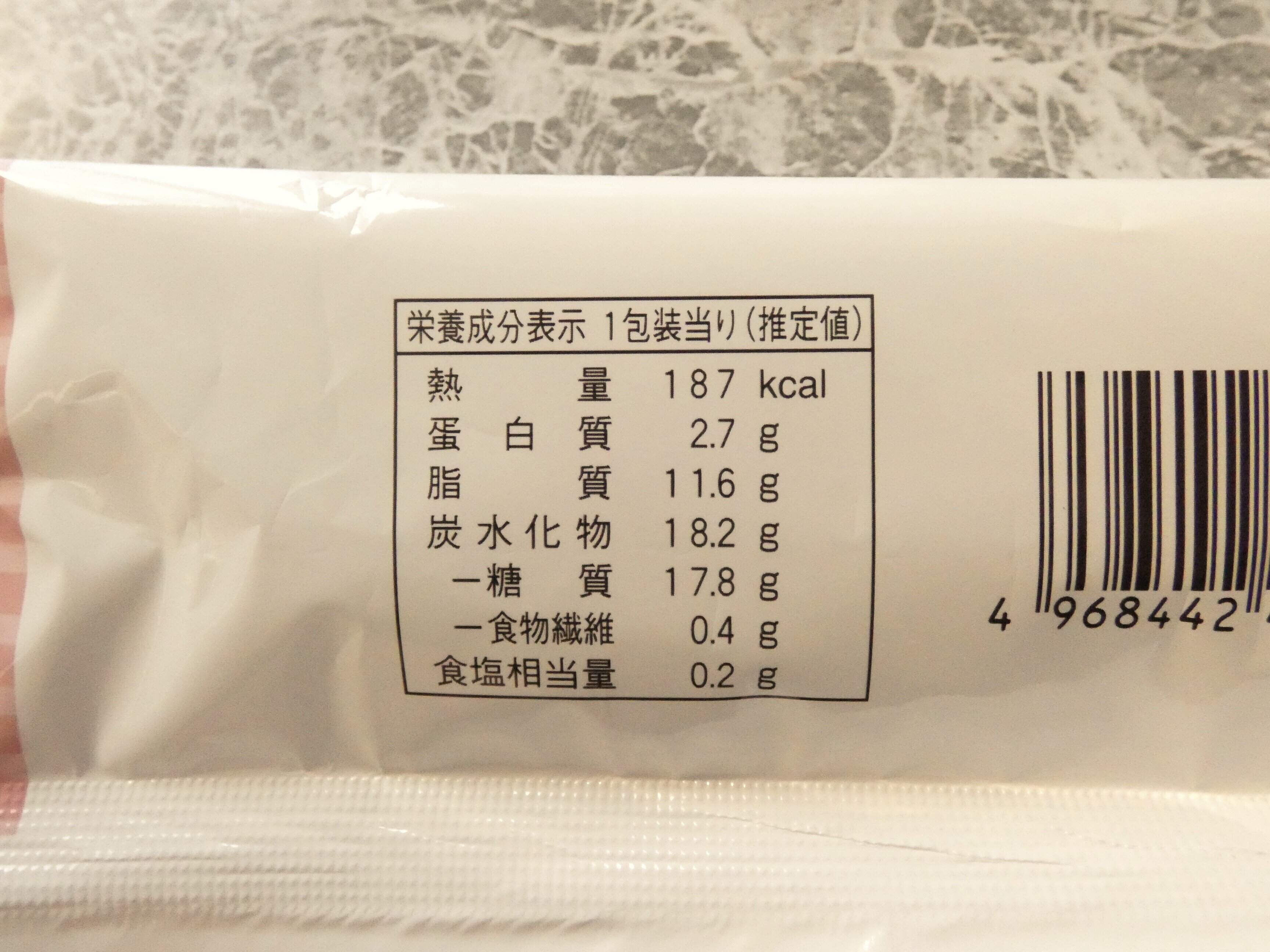 栄養成分表示を見ると1個のエネルギーは187kcal。生クリームたっぷりですが、カロリーは思ったより控えめです。