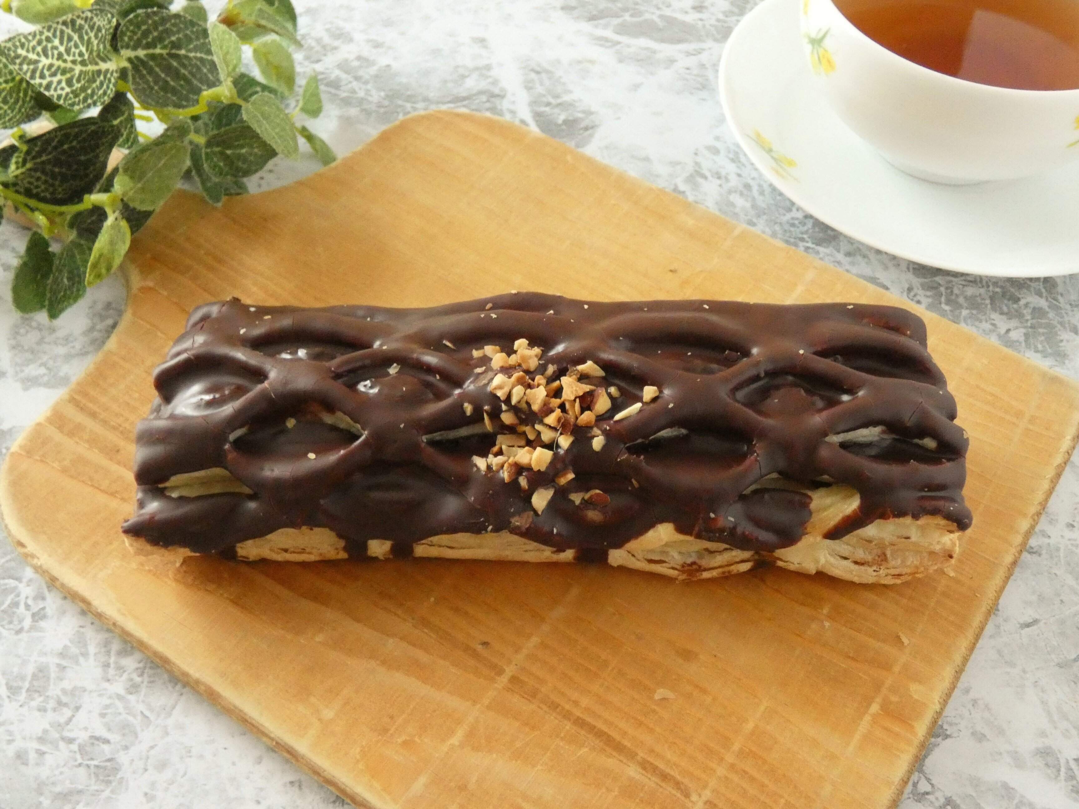 カットするとパイ生地はサクサク。パイ生地の間にはチョコケーキ生地と角切りのチョコがぎっしりと入っていて、表面はチョココーティングしてあります。