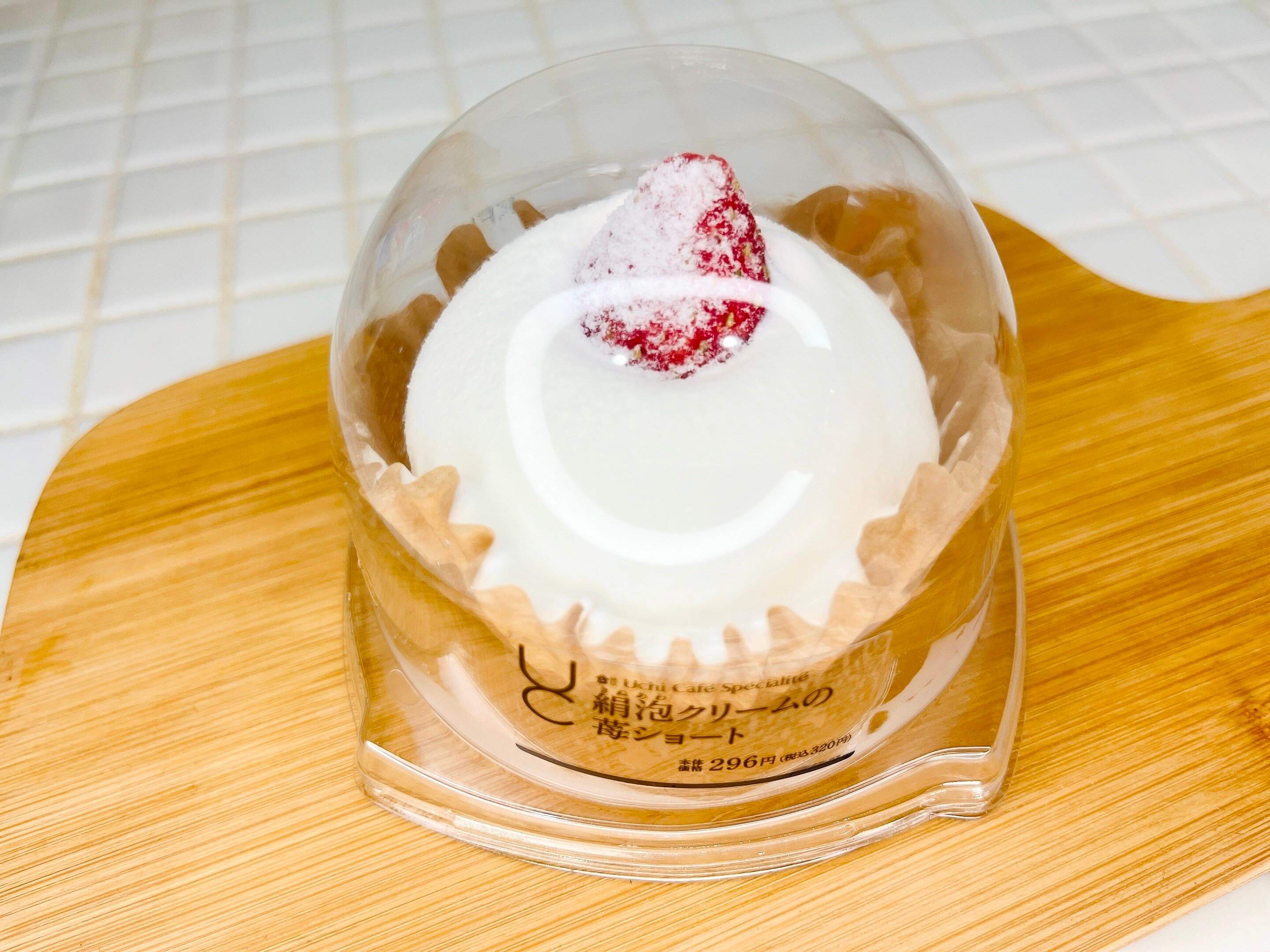 見た目のフォルムも可愛く、ほぼクリームの、クリーム好きにはたまらない苺ショートケーキ「Uchi Café Spécialité 絹泡クリームの苺ショート」は320円。