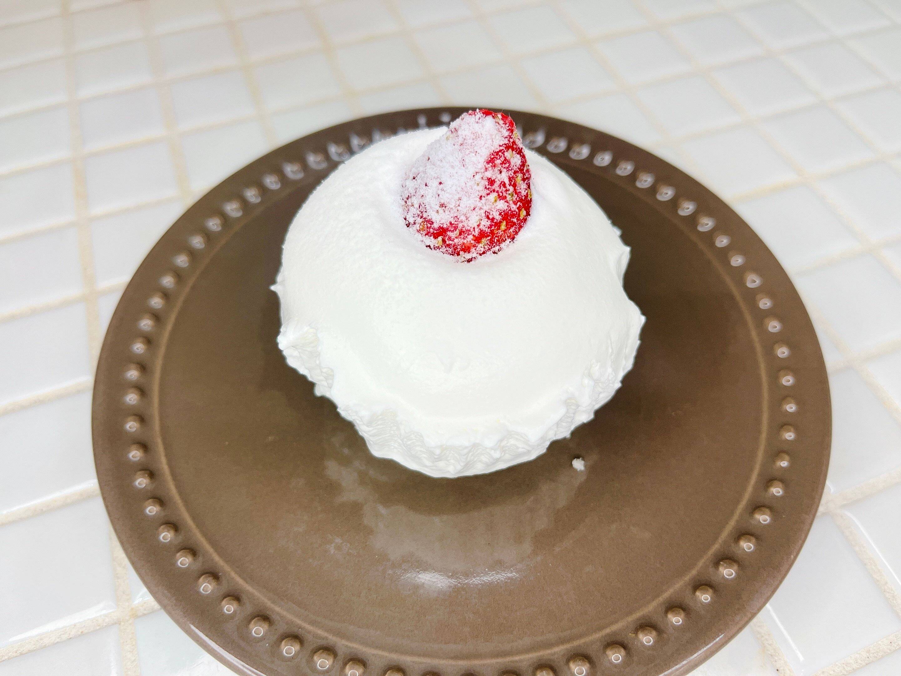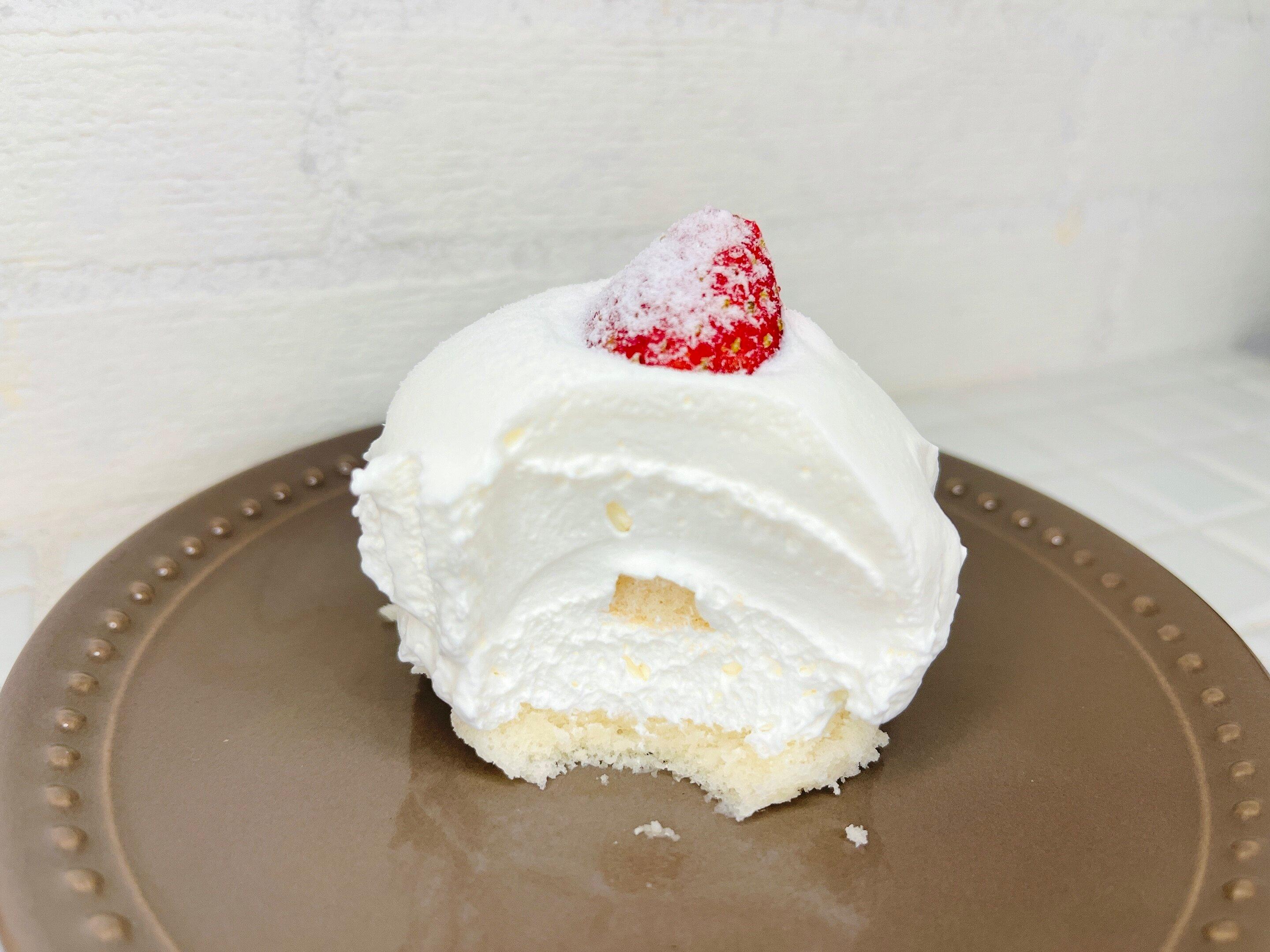 半分にカットされた苺と、見るからにふわっふわなクリームで覆われた、ドームのように丸いフォルムのケーキが出現!粉砂糖もかかっていて極上感な気分になります。早速頂いてみました。