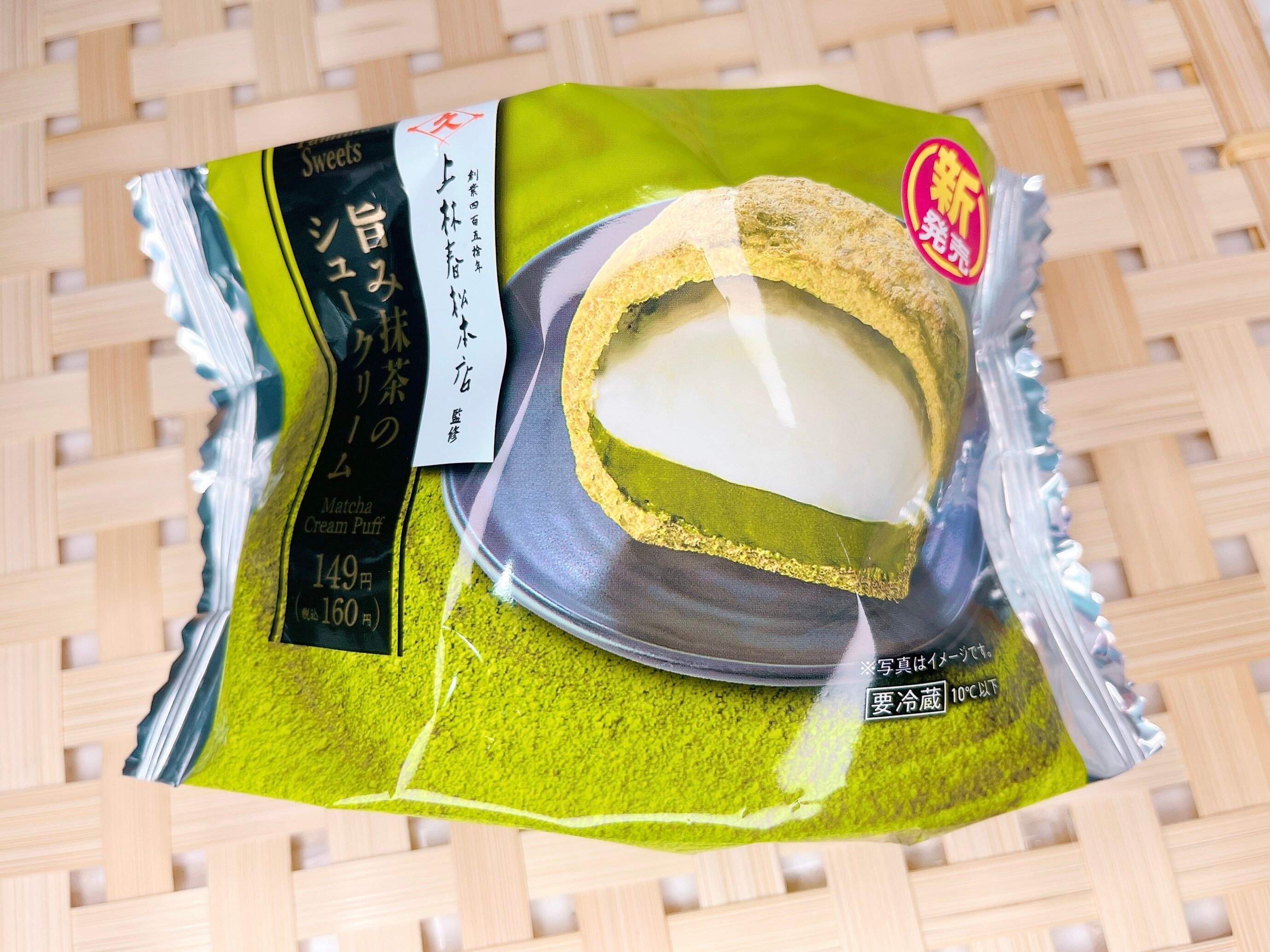 ファミマの新商品『旨み抹茶のシュークリーム』(160円)。創業四百五十年 上林春松本店監修の本格抹茶シュークリーム。